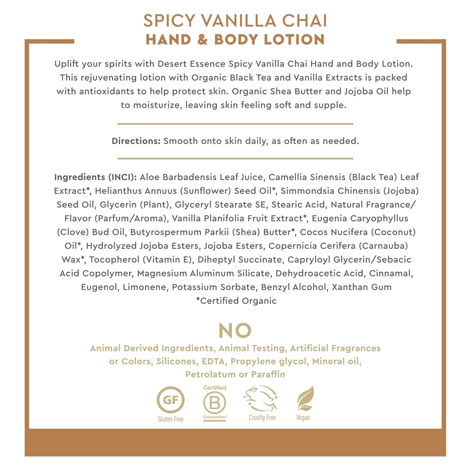 - Certified organic - desert essence spicy vanilla chai hand and body lotion uses natural ingredients and is certified to nsf organic standard.