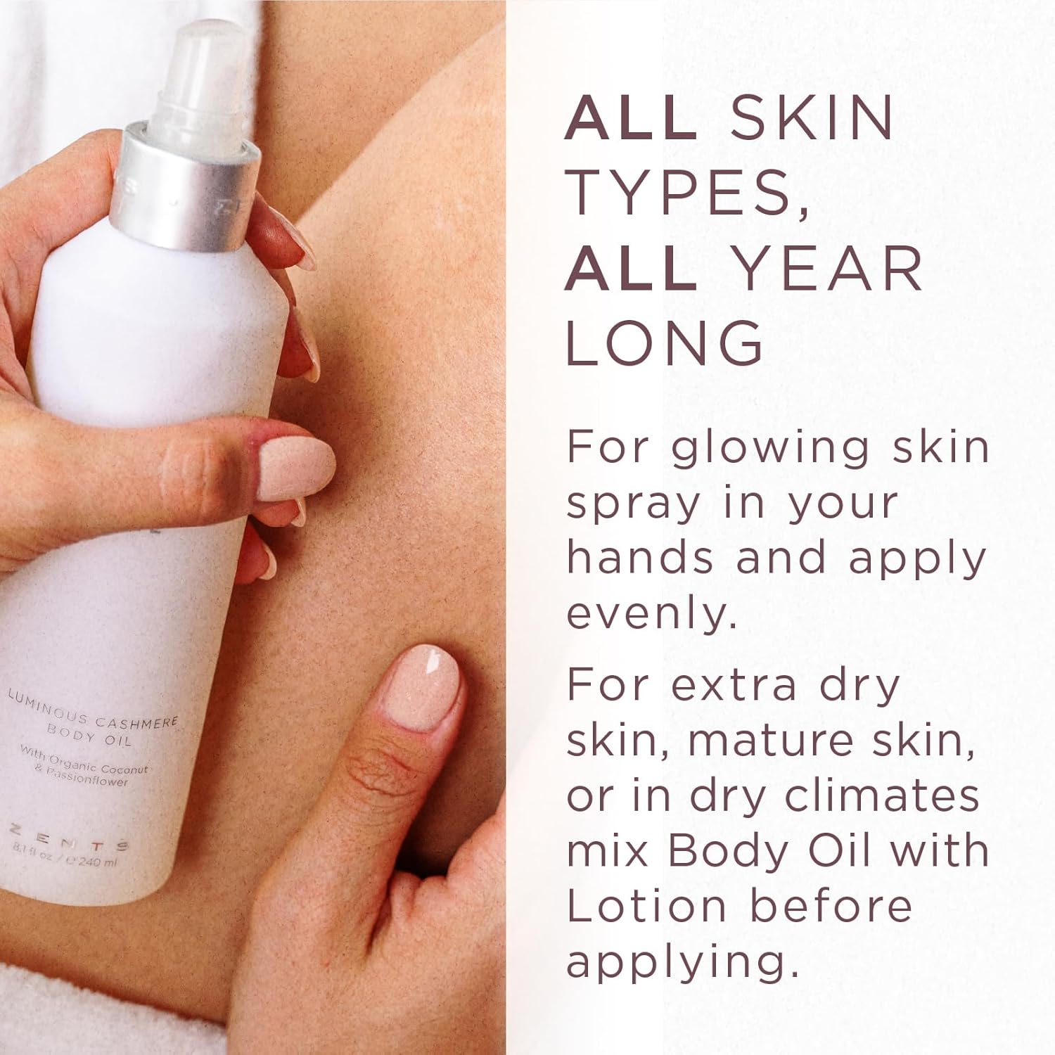 - GLOWING SKIN. Soften and restore your skin with a beautiful blend of coconut oil, passionflower and antioxidant-rich vitamin E. Spray allover or add to lotion for an irresistibly sexy sheen with a lightweight, elegant scent. "