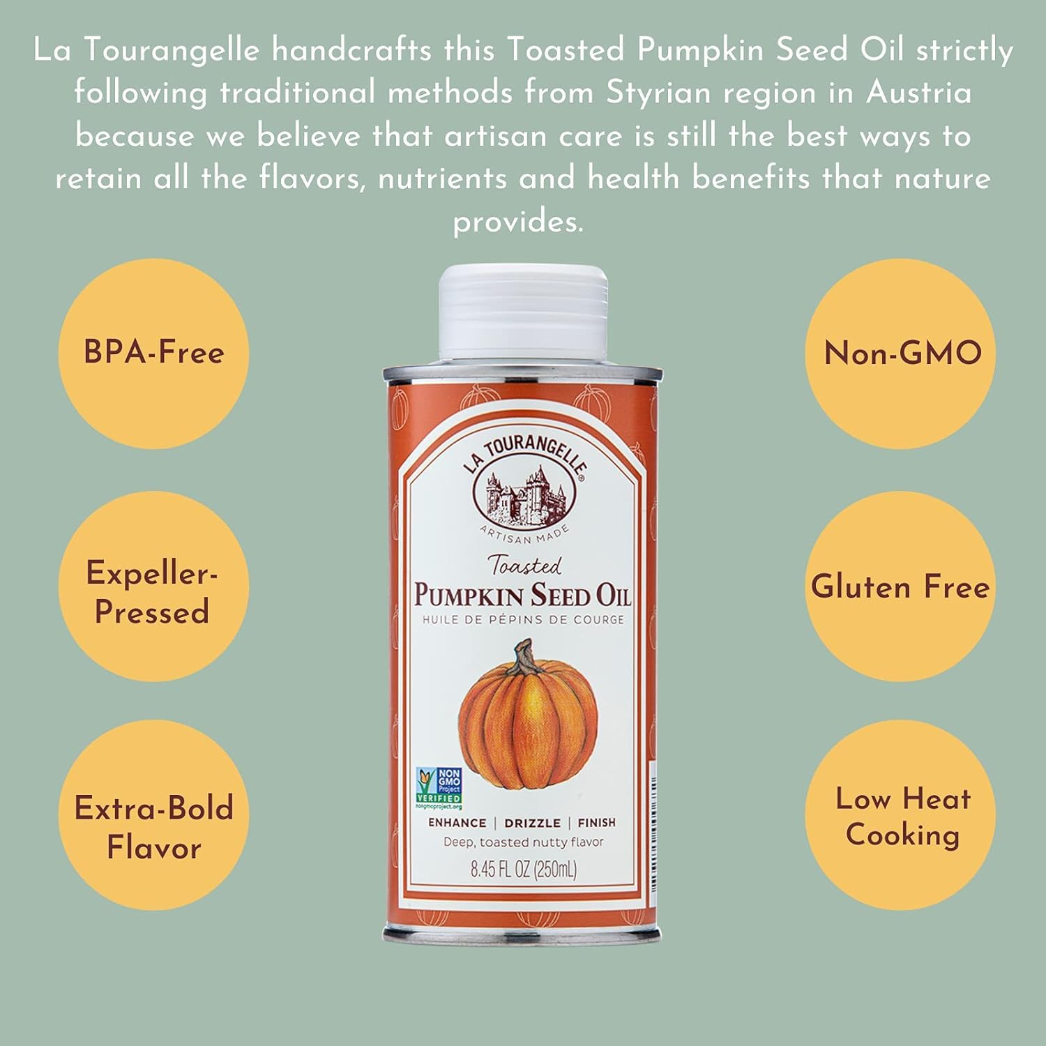 - Gourmet and Sustainable: La Tourangelle's natural artisan oils provide the perfect touch to make a delicious breakfast, lunch, or dinner. We are passionate about making high-quality ingredients that are good for the table, community, and planet. Through artisan production methods and nature-friendly tin packaging, we want to empower people to cook like they care.