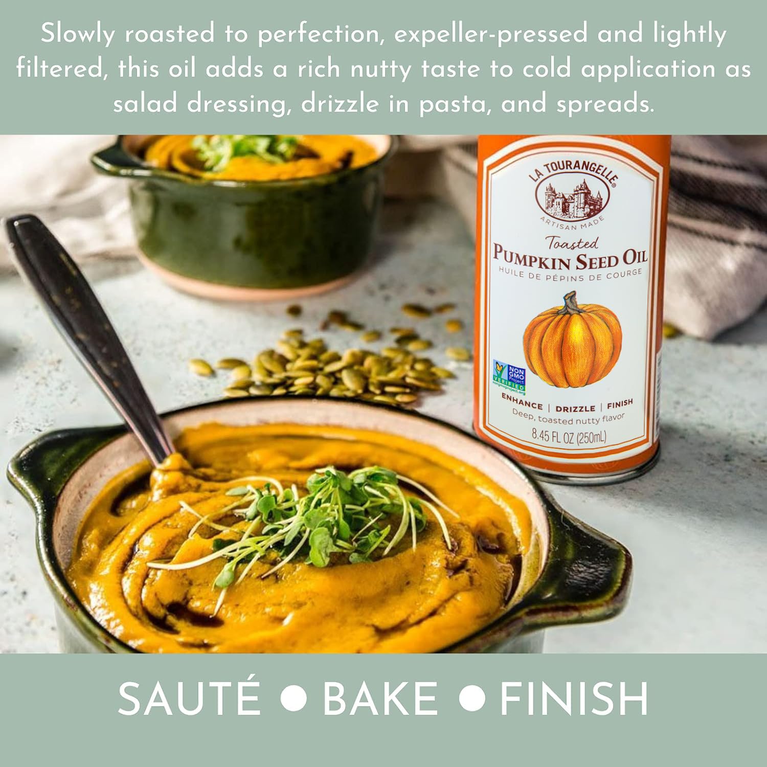 - Extraordinary Meals: La Tourangelle Toasted Pumpkinseed Oil adds a rich, nutty taste to cold application such as in salad dressings, fresh fruit, or drizzled over pasta.