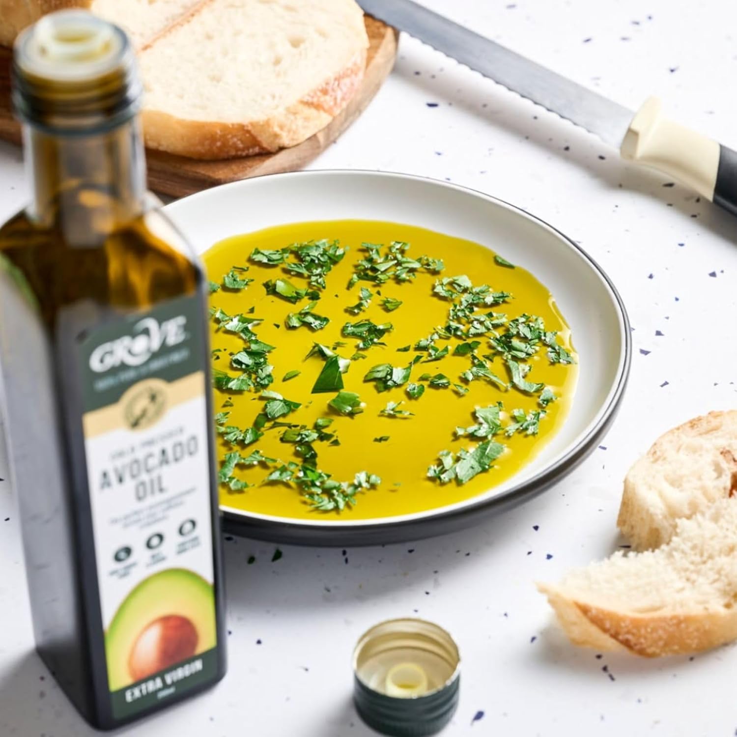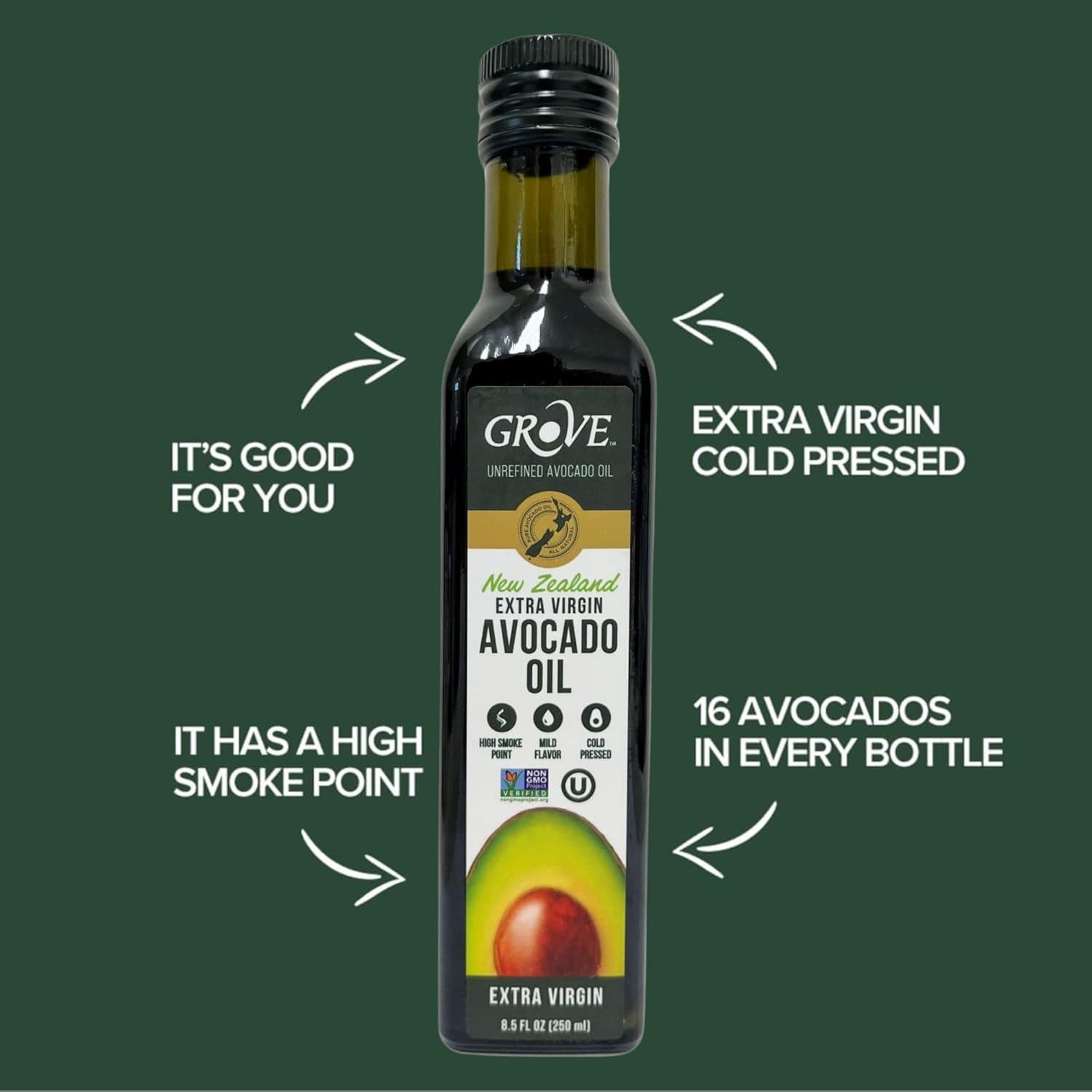 Grove Extra Virgin Avocado Oil - Plant Based, Vegan, Gluten Free, 100% Natural, Cold Pressed, High Smoke Point, 16 Whole Avocados in Every Bottle (8.4oz, 250ml)