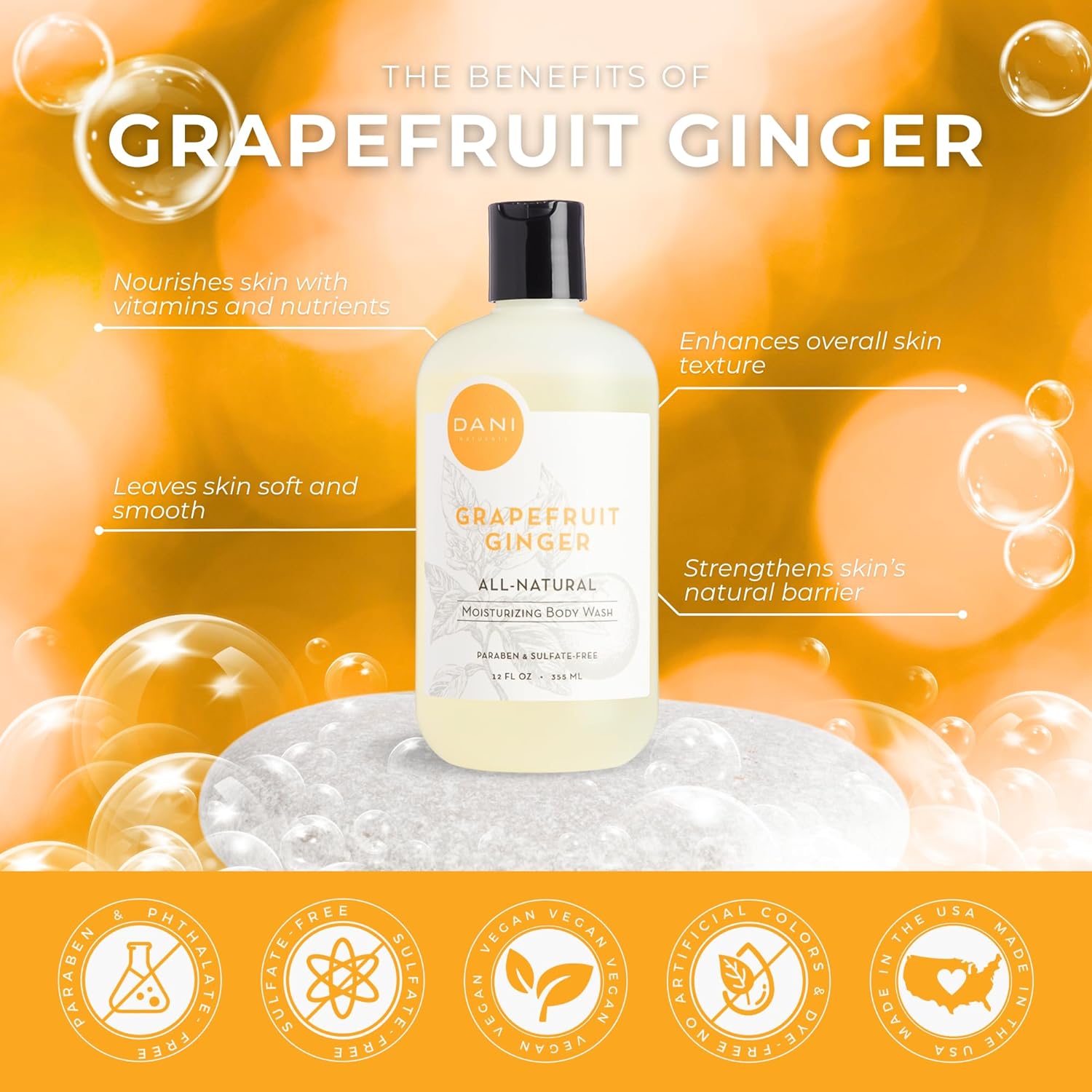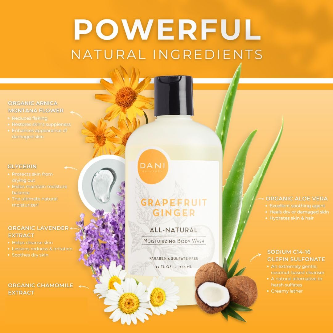 DANI Naturals Moisturizing Body Wash - Grapefruit Ginger Scent, Organic Aloe Vera & Glycerin, Sulfate-Free, Vegan, pH-Balanced, 12 oz - Refreshing, Moisturizing Shower Gel for Soft Skin