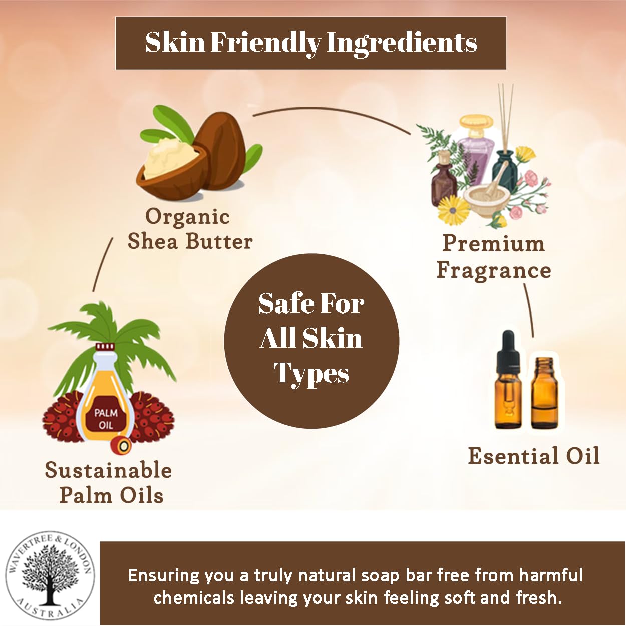 - 📋 Soap Bar Ingredients: Sustainable Palm oil, Palm Kernel Oil, Aqua (water), Certified Organic Shea Butter, Vegetable Glycerin, Essential Oils and/or Fragrance, Sodium Gluconate (natural sugar-based preservative), Sodium Chloride, Titanium Dioxide (food grade)