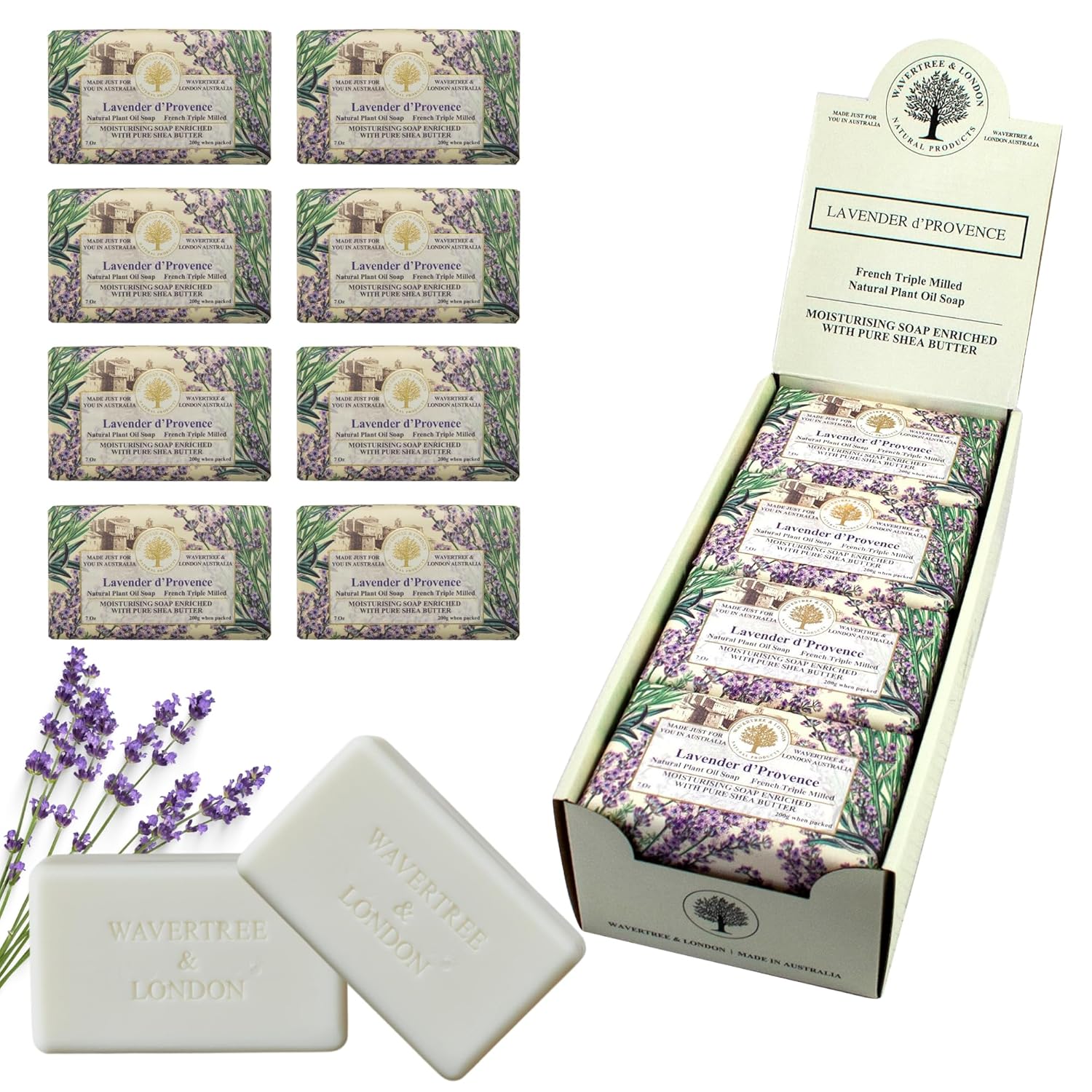 Wavertree & London Lavender D'Provence Scented Natural Soap (8 Bars), 7oz Moisturizing French Triple Milled Soap Bars enriched with shea butter - Pure Plant Oil Bath & Body Bars for All Skin Types