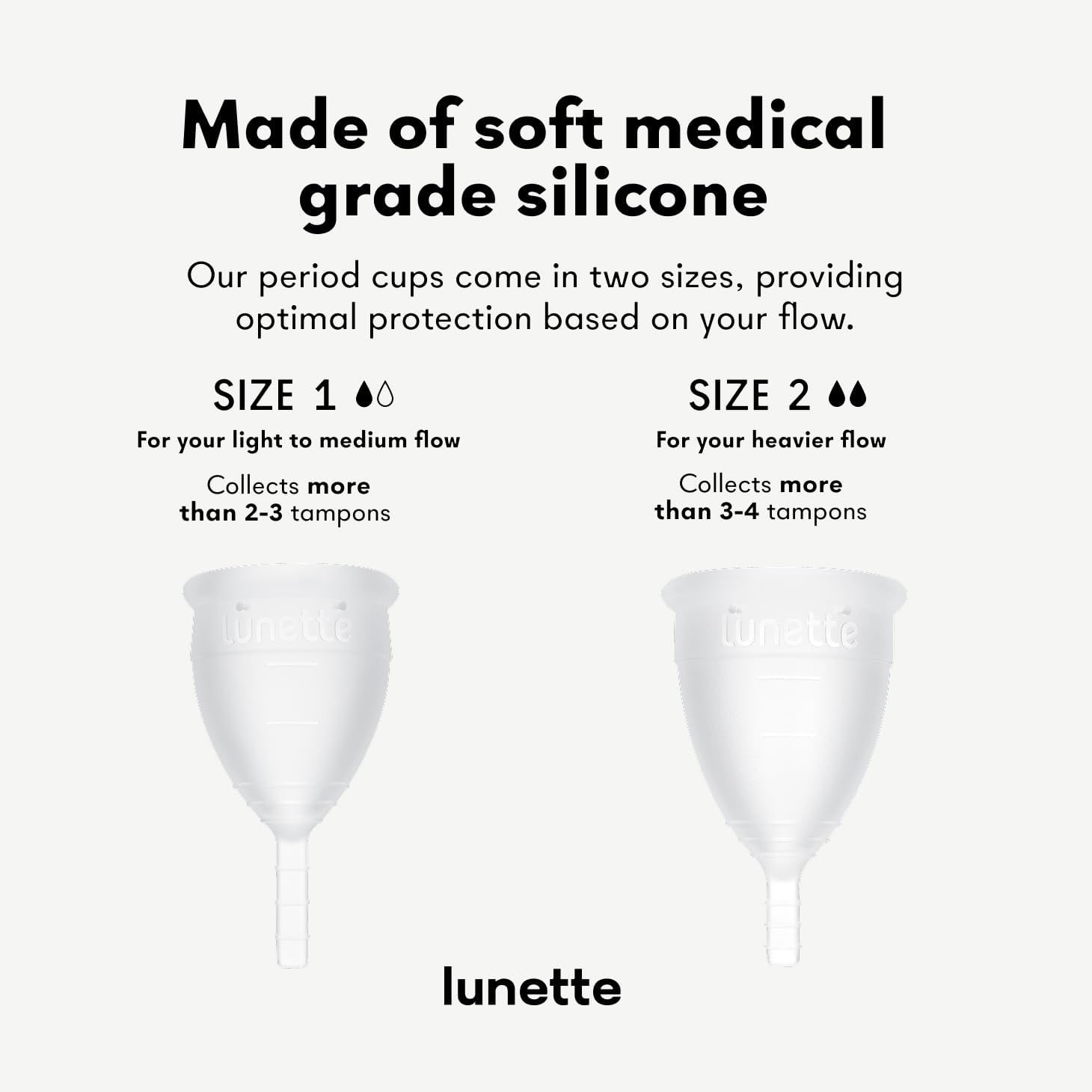- Lunette Period Cup comes in 6 colors in 2 sizes. Comfortable fit with a freedom to change less often as it can be worn for up to 12 hrs. Lunette Period Cup Size 2 is perfect for medium to heavy flow