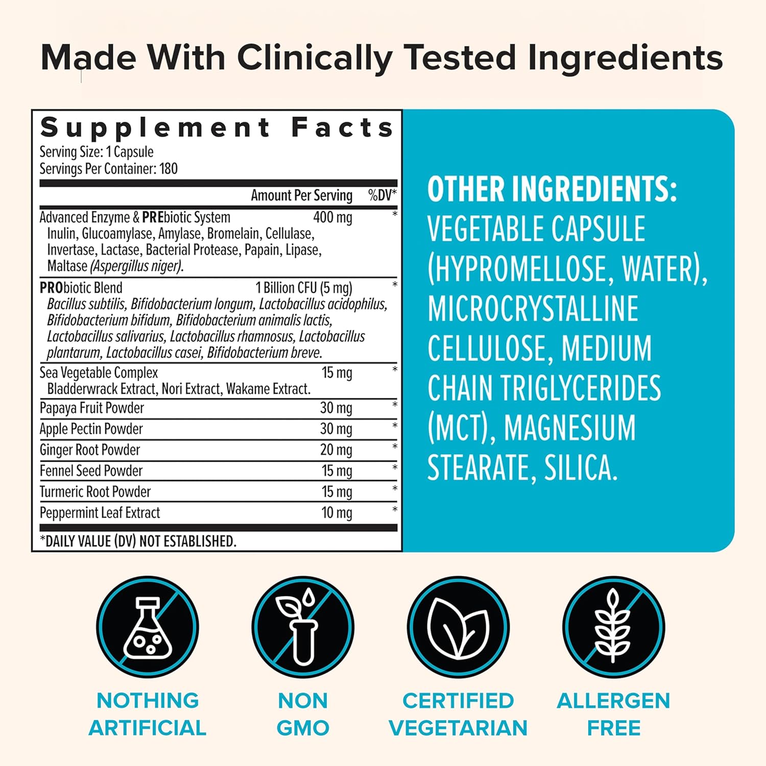 - Special Ingredients : Probiotics, Bacillus Subtilus, Lactobasillus, Bromelain, Papaya, Lactase, Lipase, Prebioitic, Inulin