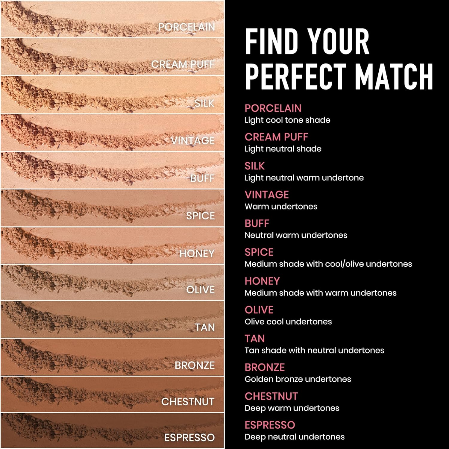 - PERFECT MATCH FOR EVERY SKIN TONE: Frankie Cosmetics Compact Powder is available in 12 drop-dead gorgeous shades so that you can find a perfect match for your skin tone: Cream Puff, Porcelain, Silk, Vintage, Buff, Spice, Honey, Olive, Tan, Bronze, Chestnut, and Espresso.