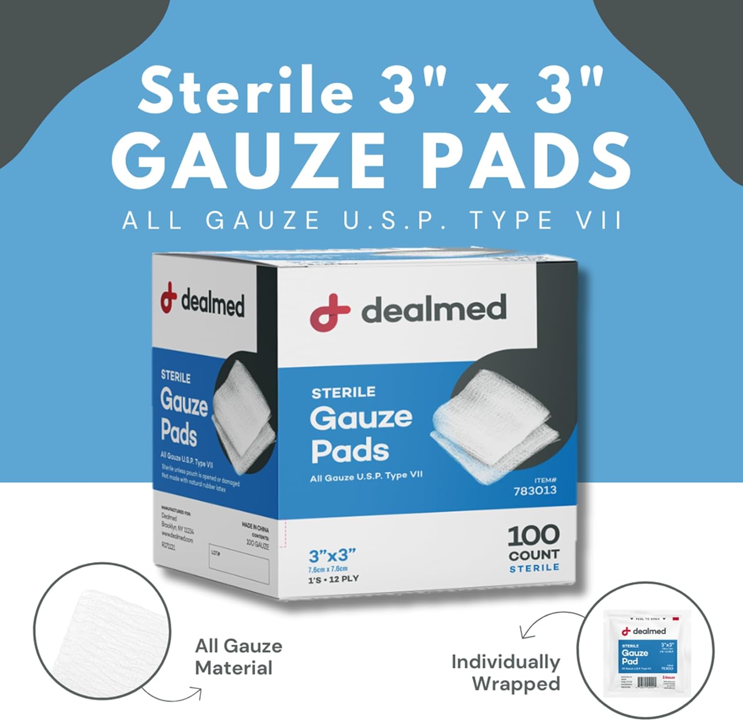 - Dealmed Sterile Gauze Pad Wound Dressing: The Dealmed Sterile Gauze Pads are designed with high grade USP Type VII cotton that withstands both wet-to-moist and wet-to-dry dressing. They are well suited for any small wounds, cuts, abrasions, ulcers, and more. Depending on wound size, the gauze pads can be easily cut to the prefct size that is needed.