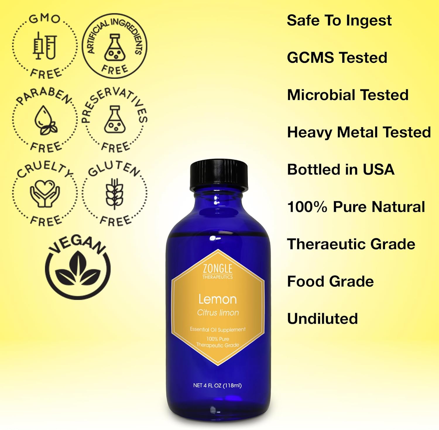 Lemon Essential Oil, Food Grade, for Cooking, Baking – 100% Pure, Lemon Oil, by Zongle Therapeutics, 4 OZ