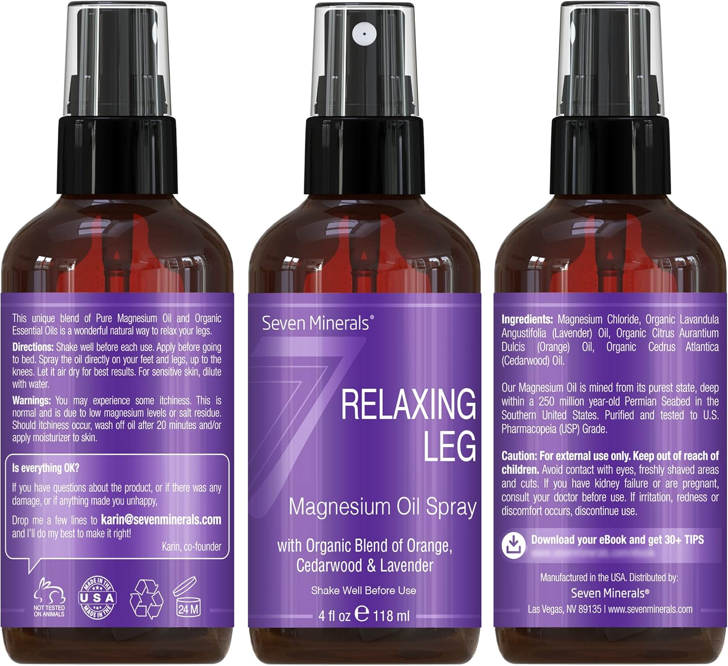Seven Minerals Relaxing Leg Magnesium Spray, Powerful Blend of Essential Oils (Orange, Cedarwood, & Lavender), That Calms Legs Naturally. 4 fl oz,