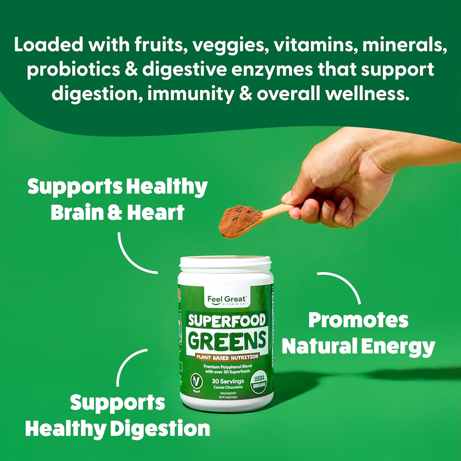 Feel Great Organic Superfood Greens Powder - Cocoa Chocolate | Fruit & Vegetable Supplement | Over 20 Greens, Fruits & Veggies, Fiber, Probiotics & Digestive Enzymes | 30 Servings
