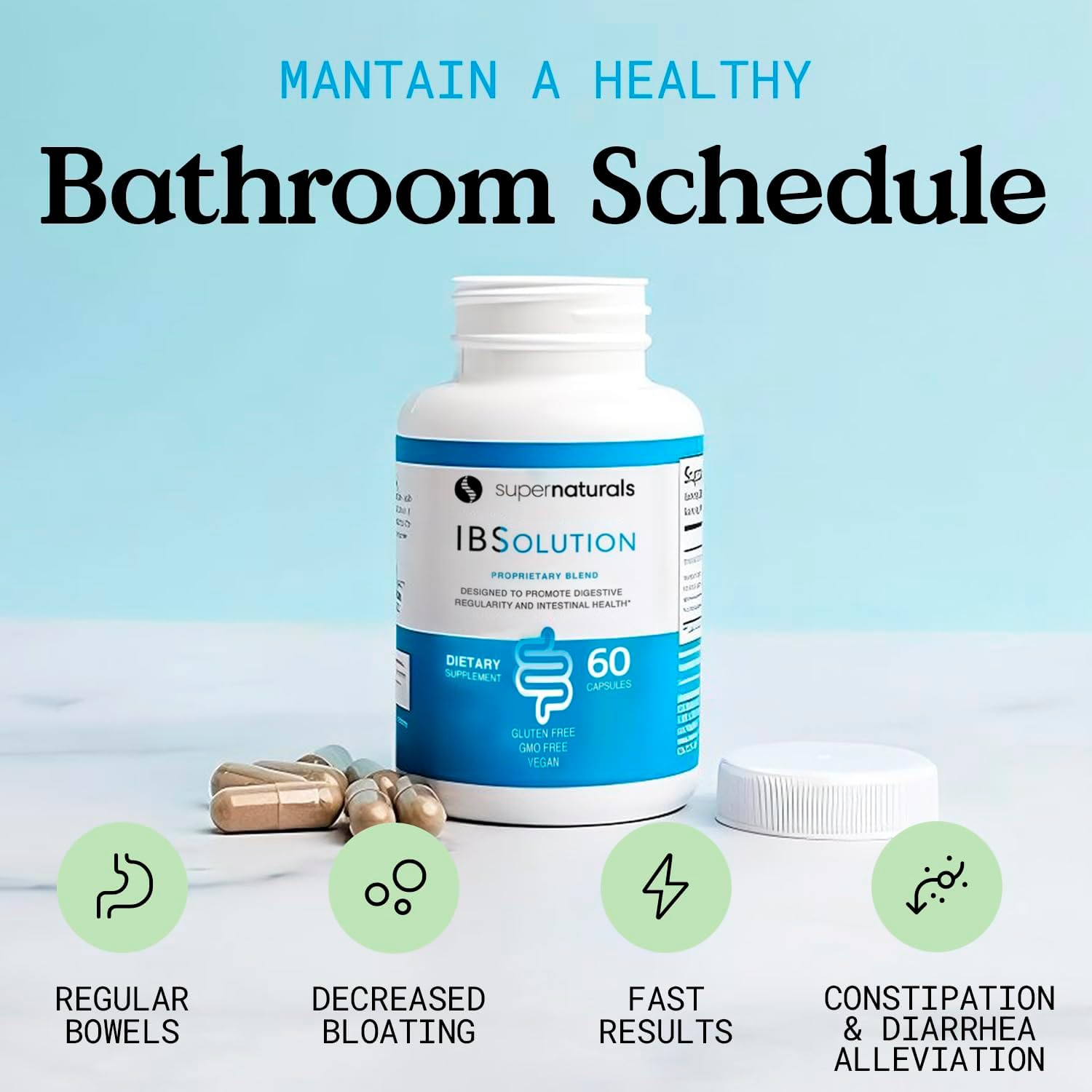 SuperNaturals IBSolution - Made in USA, Non-GMO, Gluten Free & Vegan (60 Capsules) - for Symptoms of IBS (Bloating, Constipation, Gas, Diarrhea, Abdominal Pain)