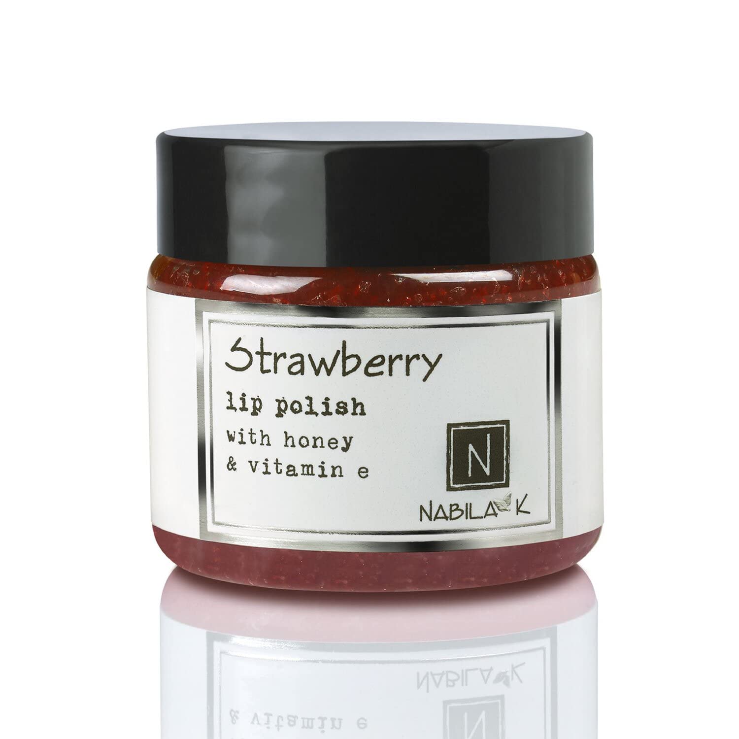 - Nabila K Strawberry Lip Polish is a natural, sugar-based lip polish scrub for dry lips. A lip exfoliator made with nourishing, real ingredients like sweet almond oil and honey smooth lips, leaving them feeling super soft. Sloughs off dry skin and flakiness to reveal beautiful, healthy lips.