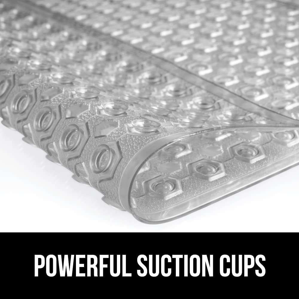 GORILLA GRIP Patented Bath Tub Shower Mat, Machine Washable Bathtub Floor Liner Mats, Suction Cups and Drain Holes to Keep Tubs Clean, Soft on Feet, Bathroom Essentials, 35x16 Inch, Clear Gray