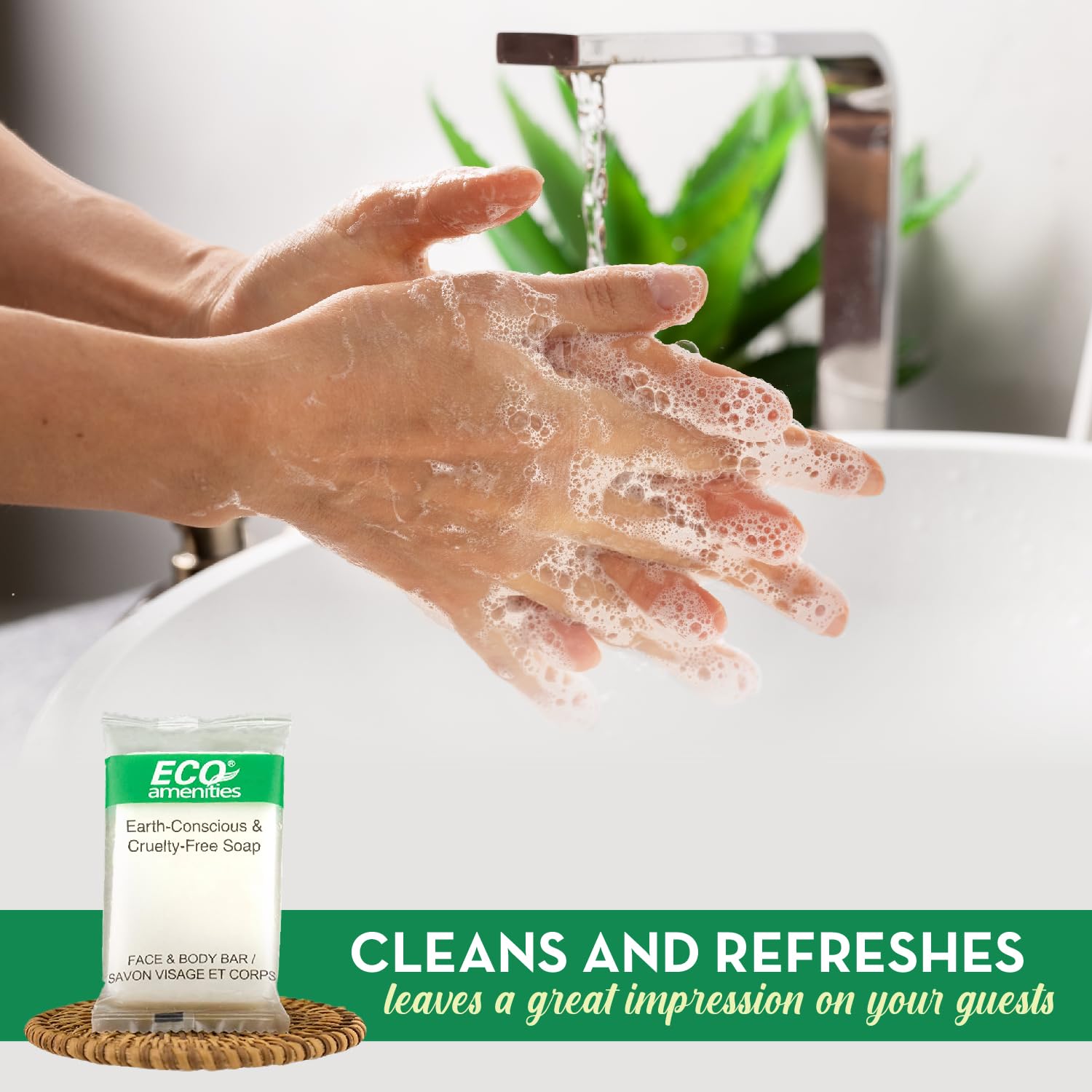 - Sustainable and Cruelty-Free: Eco Amenities bar soap is made with natural ingredients and biodegradable packaging, never tested on animals.