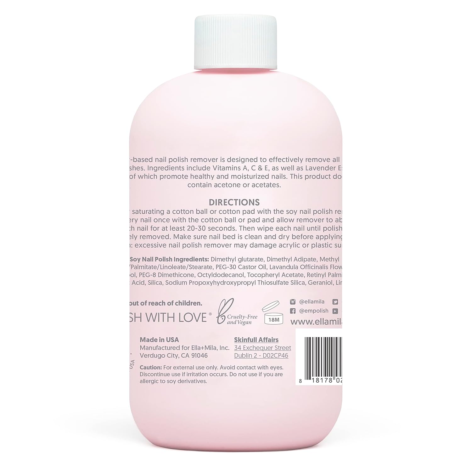- Soy Based Nail Polish Remover by ella+mila: Non-toxic nail polish remover made without acetone & alcohol; Formulated to effectively remove natural nail polishes; Not intended for gel polish; Enriched with lavender essential oils & vitamins A, C & E to promote healthy & moisturized nails