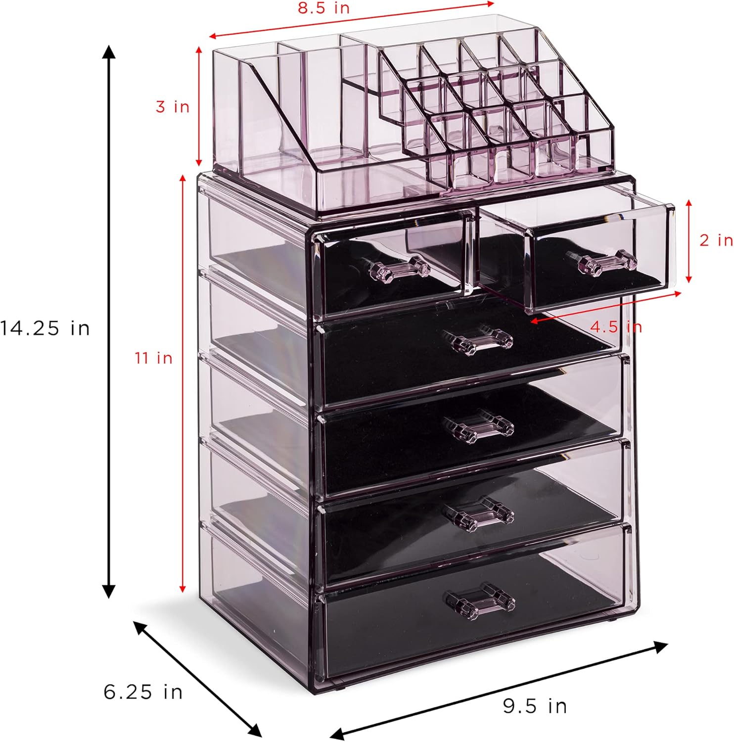 - Durable & long-lasting - Made of durable acrylic-like clear plastic - Includes 4 large drawers, 2 small drawers and 16 slot compartments - Drawers slide open smoothly with easy grip handles - Can also be used to complement other organizers by Sorbus - Measures approximately 9.25” L x 6.25” W x 14.25” H (drawers 1.87” deep)