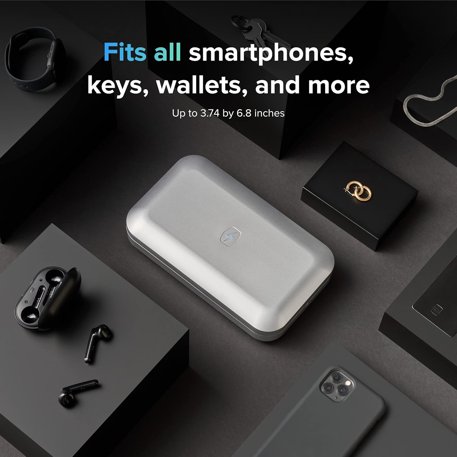 - Disinfects More than Just Phones; The PhoneSoap 3 fits all smart phones - even larger models like the iPhone 8+ or Galaxy S10+ - and can disinfect more than just phones. Add your keys, wallets, headphones, jewelry, glasses, and more. Interior Dimensions: 6.8 x 3.74 x 0.78 in.