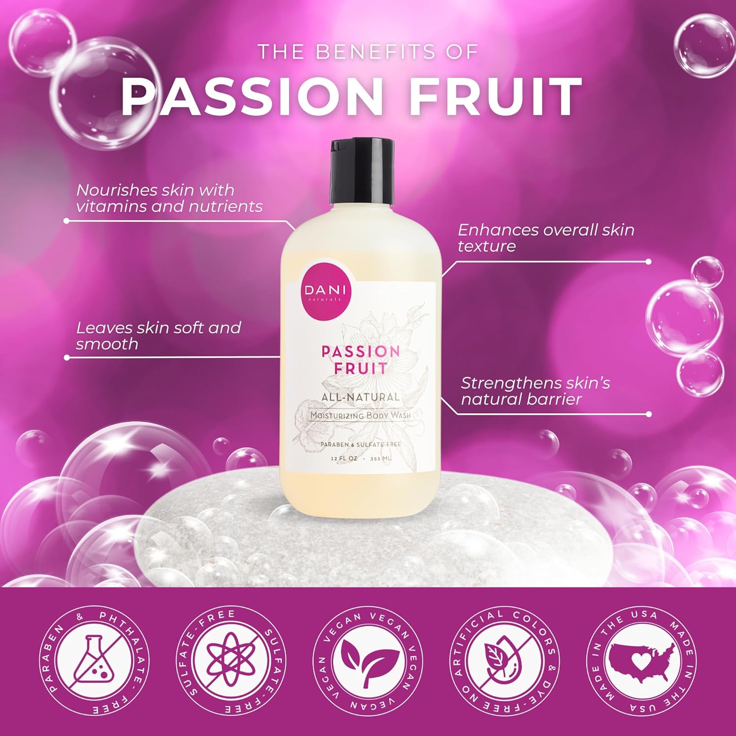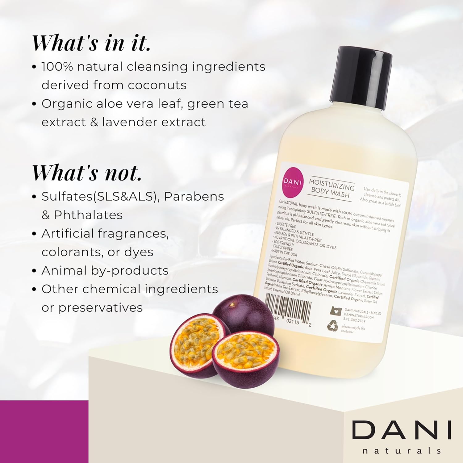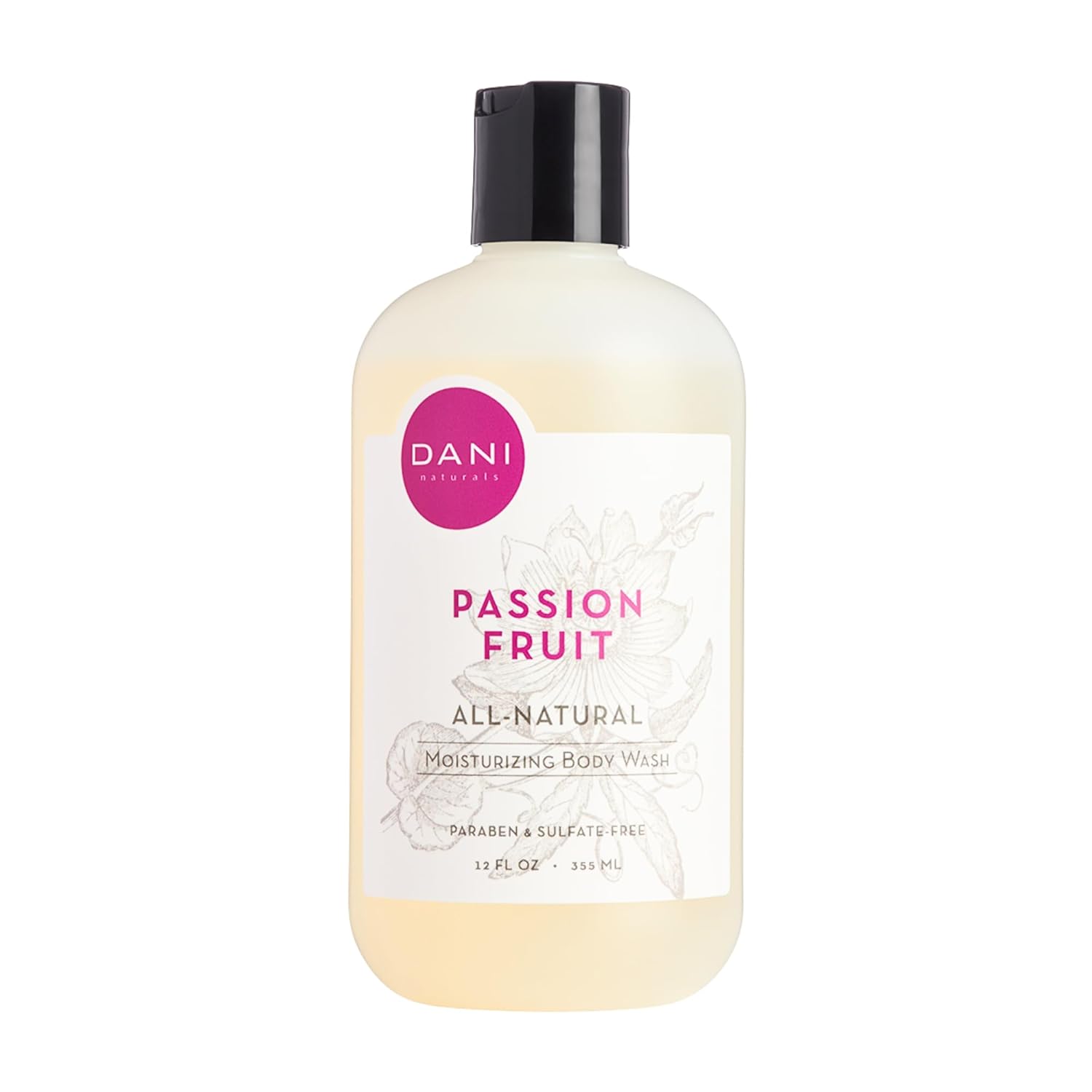 DANI Naturals Moisturizing Body Wash - Sweet Passion Fruit Scent with Organic Aloe Vera & Natural Glycerin - Sulfate & Paraben-Free Shower Gel - 12 oz - Vegan & Cruelty-Free