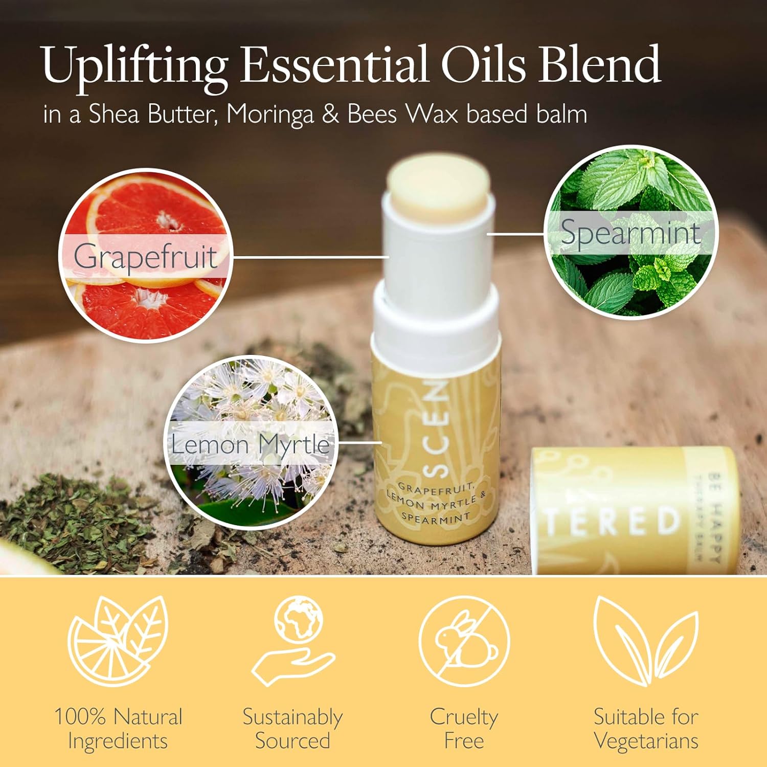 - Premium Essential Oil Blend: 100% Natural – Scentered's Happy Balm combines grapefruit essential oil, lemon myrtle essential oil, and Spearmint in a nourishing Shea Butter base, delivering 100% natural support for positivity. Cruelty-free and suitable for vegetarians.