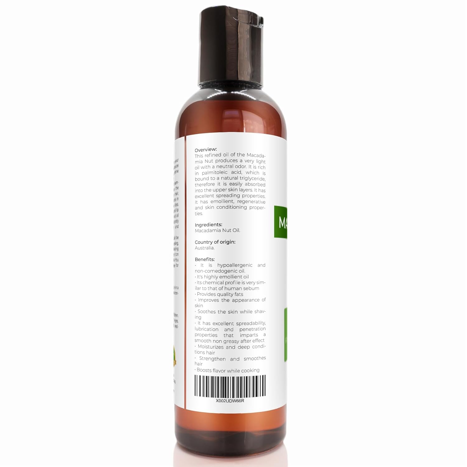 - Macadamia Oil: 100% Pure and Natural Carrier Oil. Refined. Expeller Pressed. Not Diluted, Non-GMO, No Additives, No Fragrance, Chemical Free, Alcohol Free.