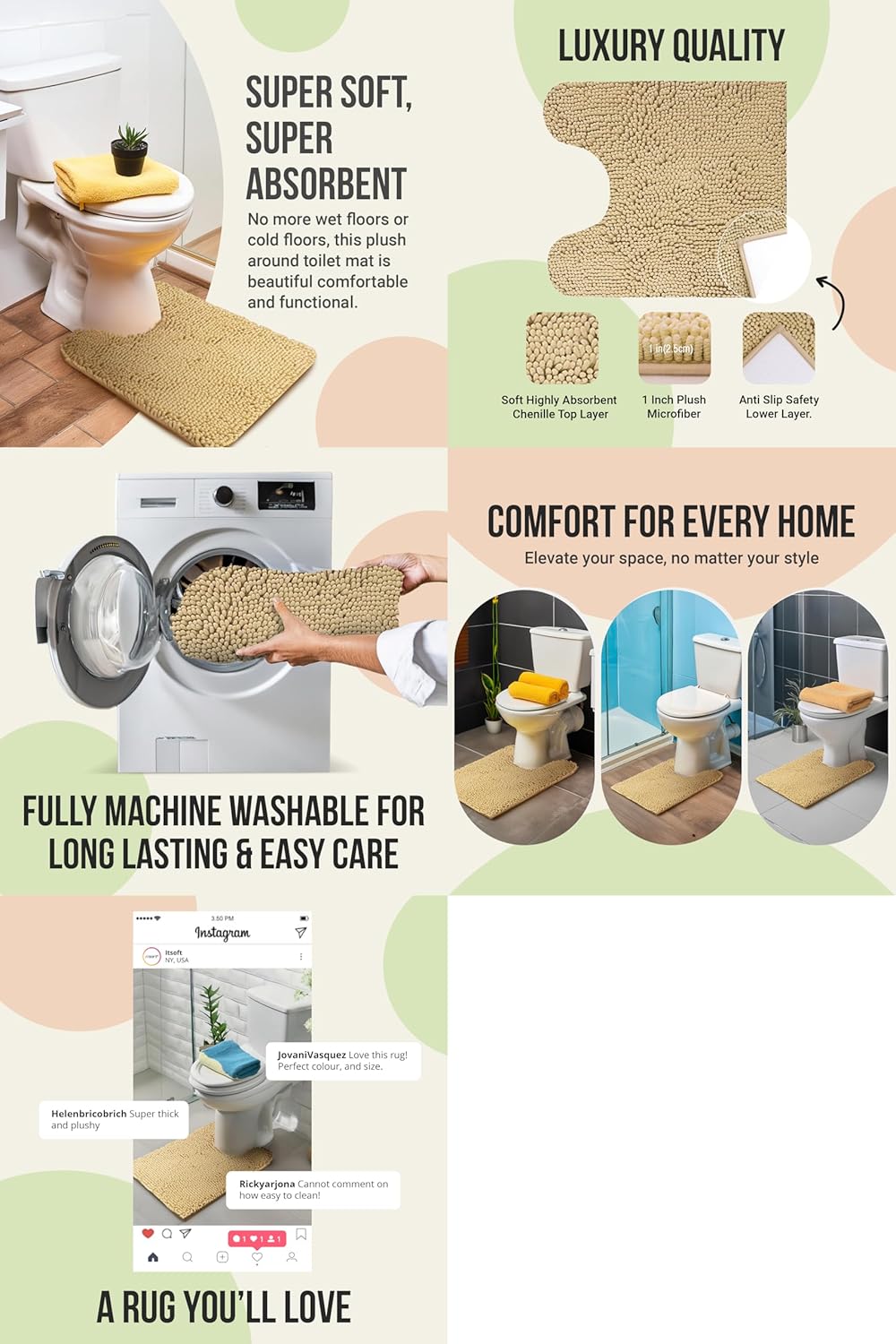 ITSOFT Non-Slip Shaggy Chenille Toilet Contour Bathroom Rug with Water Absorbent, 24 x 21 Inches U-Shaped Beige