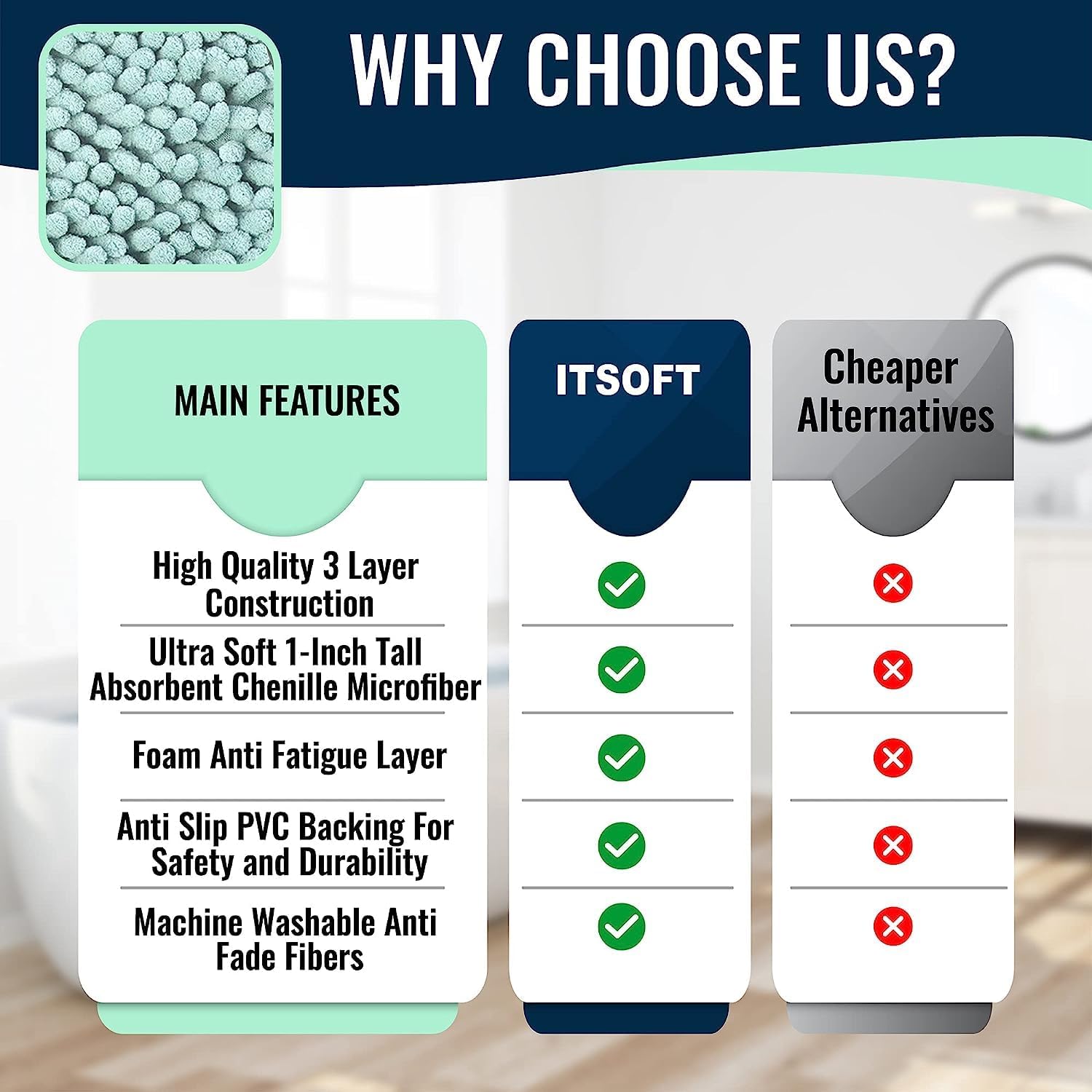 - Plush 1" pile with 6 mm foam offers spa-like comfort underfoot. Use this bath room rug near tubs or as cozy bathroom floor mats that reduce fatigue and block cold tiles.