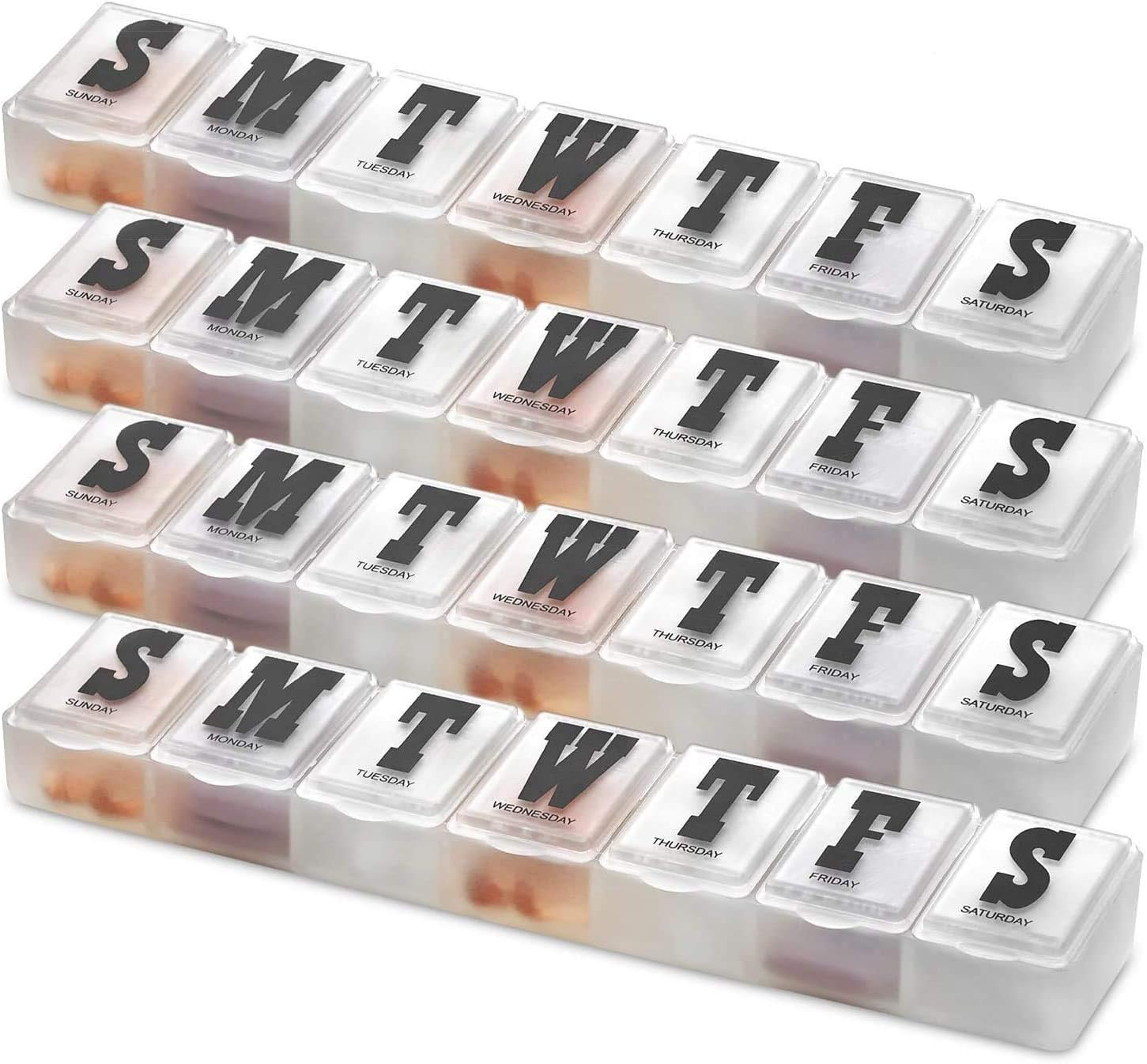 Pill Organizers - Pack of 4 Bold Letter Weekly Pill Planners for 28 Days Total to Separate Supplements, Fish Oils & Vitamins Daily Medication Reminder for Travel & Purse