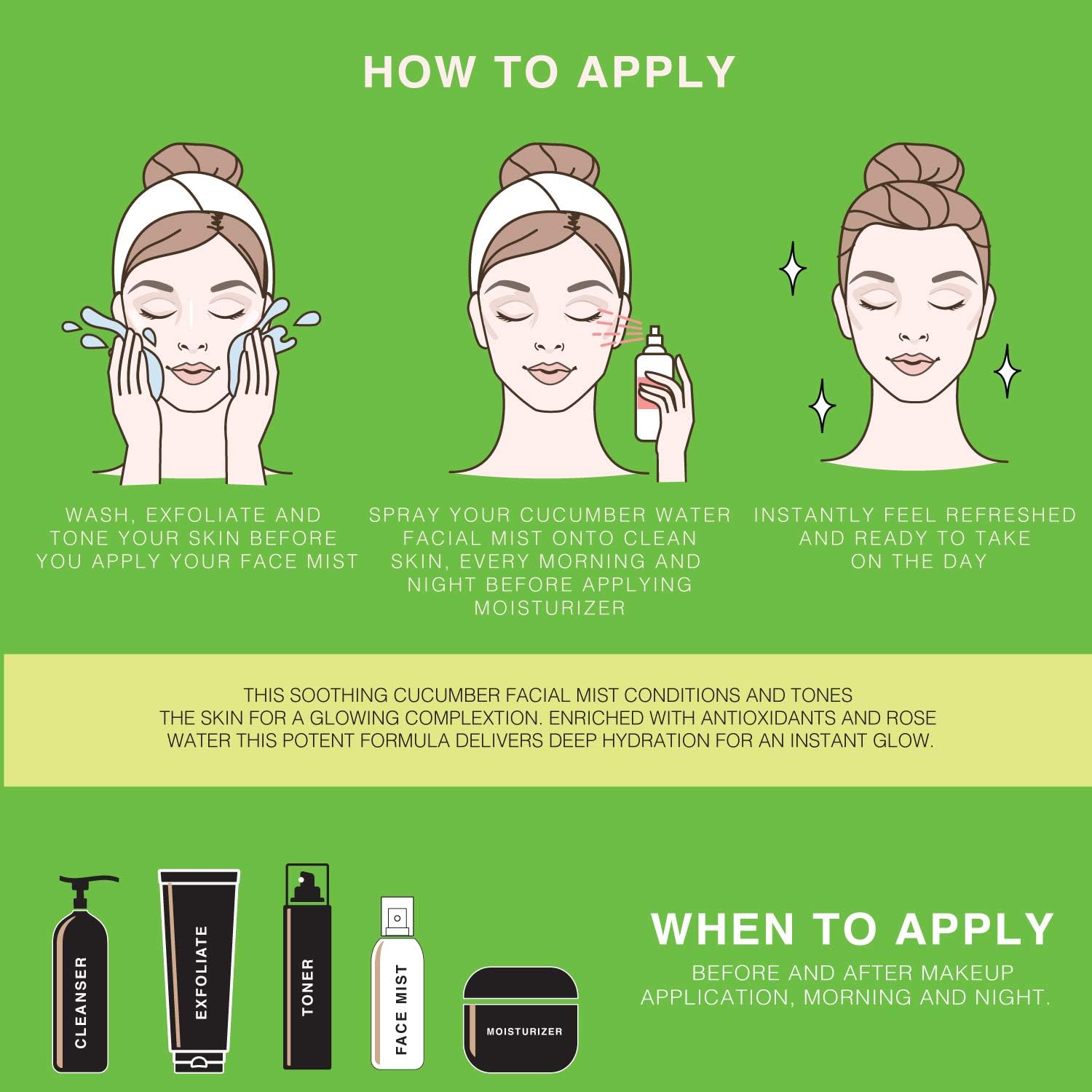- Soothing cucumber water mist conditions and tones for a glowing complexion enriched with antioxidants and rose water to minimize pores and provide instant burst or radiance