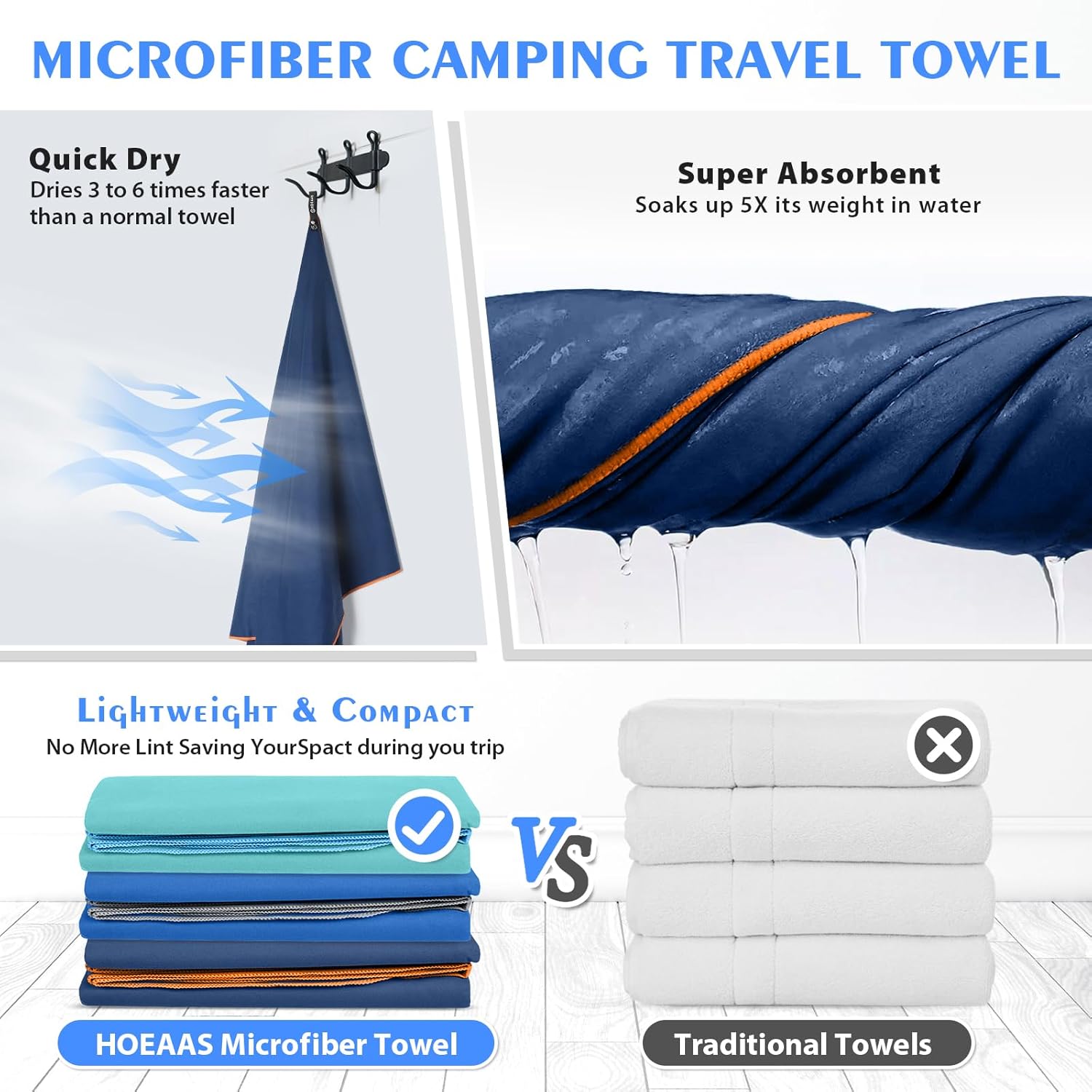 - SUPER ABSORBENT & QUICK DRYING: HOEAAS microfiber camping towel is made of soft and skin-friendly microfiber fabrics, which super absorbent and fast drying. Soaks up 5X its weight in water and dries nearly 10X faster than cotton towel, repeat use it a short time, no bad odors. So you never have to worry about your microfiber beach towels soiling or stinking up the rest of your gear. After dry your sweat or body water, Spread out or hang up the quick dry towel will be dry in minutes!