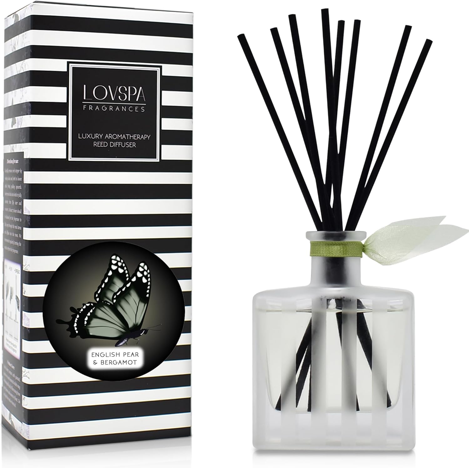 LOVSPA Reed Diffuser Set, English Pear & Bergamot Scented Oil Diffuser with Sticks, Home Fragrance Accessories for Bathroom Shelf Decor, Aroma Diffusers for Home or Office Desk, USA Made