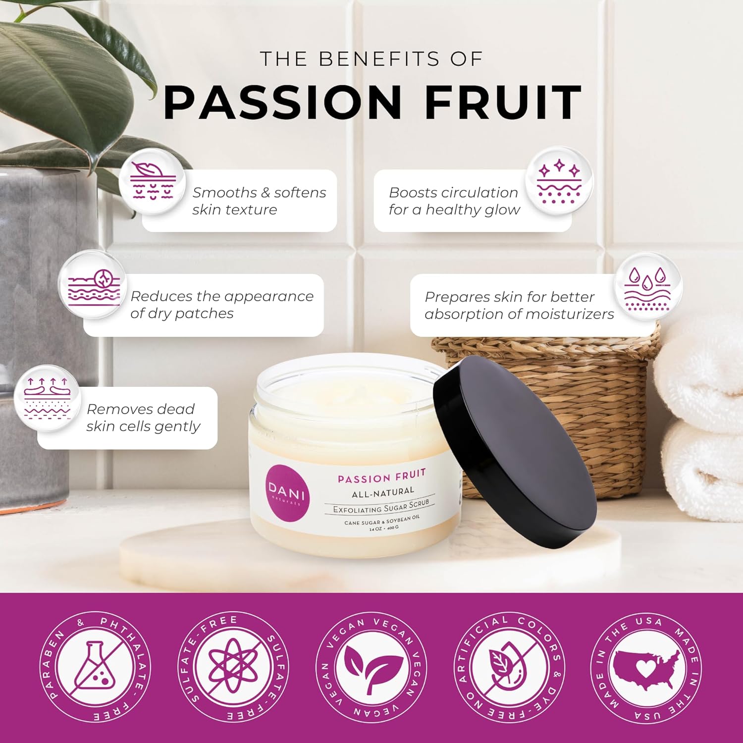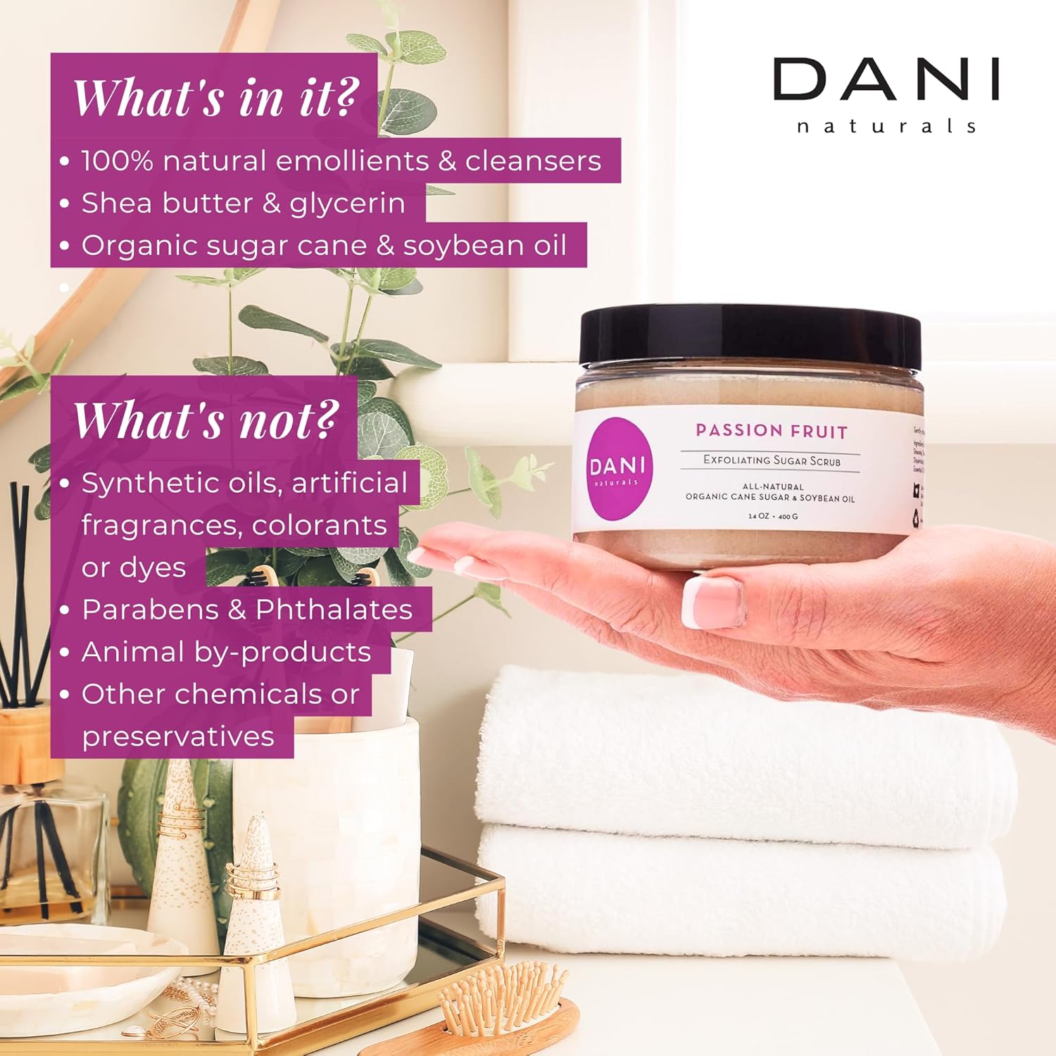 DANI Naturals Sugar Scrub – Pure & Gentle Exfoliation with Juicy Passion Fruit Scent. Organic sugar, shea butter, and nourishing oils for smooth, soft skin – 14 oz