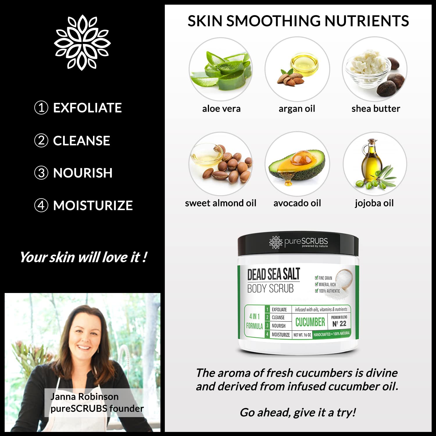 - GET ULTRA SMOOTH SKIN FAST - THIS WORKS! Our unique “4 in 1 Formula” does everything a body scrub should do and more - EXFOLIATE, CLEANSE, NOURISH & MOISTURIZE. Fine grain dead sea salt infused with essential oils, nutrients and skin softeners helps to smooth away rough, bumpy, and uneven textures to instantly reveal your true soft, healthy and radiant skin. You'll love the cucumber aroma!