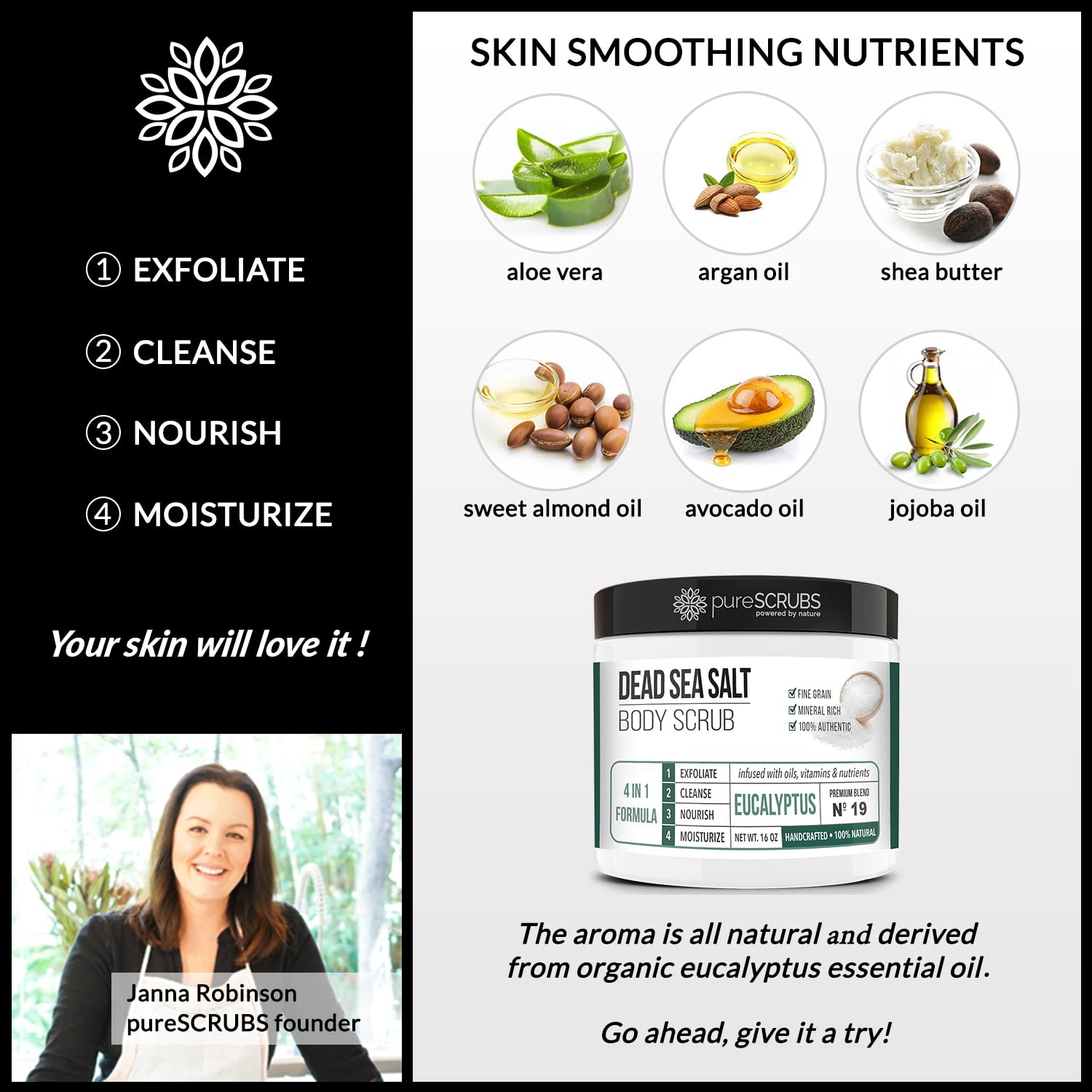 - GET ULTRA SMOOTH SKIN FAST - THIS WORKS! Our unique “4 in 1 Formula” does everything a body scrub should do and more - EXFOLIATE, CLEANSE, NOURISH & MOISTURIZE. Fine grain dead sea salt infused with essential oils, nutrients and skin softeners helps to smooth away rough, bumpy, and uneven textures to instantly reveal your true soft, healthy and radiant skin. You'll love the eucalyptus aroma!