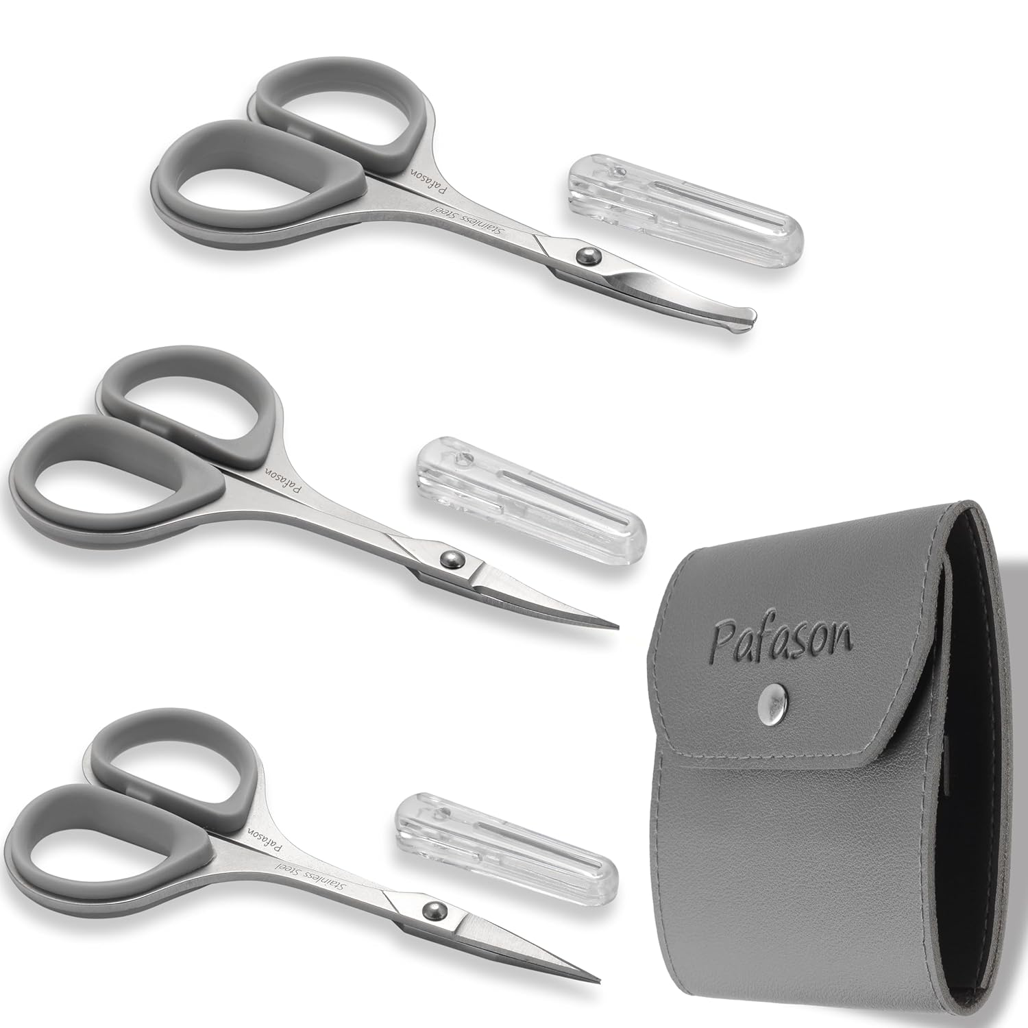 PAFASON Stainless Steel Mustache Beard Facial Nose Hair Trimming Scissor Set with Safety Cover and Leather Pouch Grey