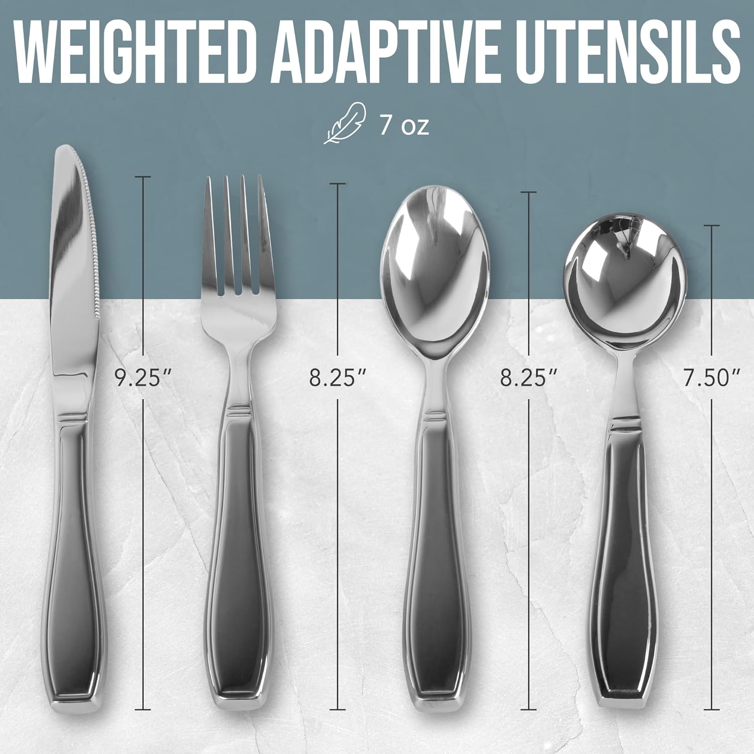 - Durable Stainless Steel Weighted Silverware - Crafted from polished stainless steel, these weighted utensils for tremors look like normal flatware but provide the added balance needed for shaky hands. 7oz each with a strong, ergonomic design ensuring long-lasting use while blending seamlessly with everyday silverware sets.