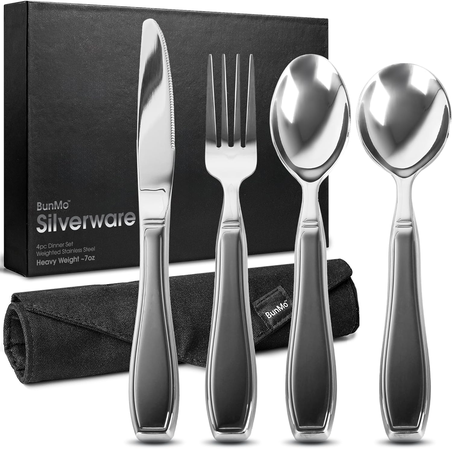 BUNMO Weighted Utensils for Hand Tremors – 4pc Adaptive Utensils for Elderly, Persons w/weak hands – Discreet Travel Wrap, Stainless Steel & Dishwasher Safe – Weighted Silverware Set