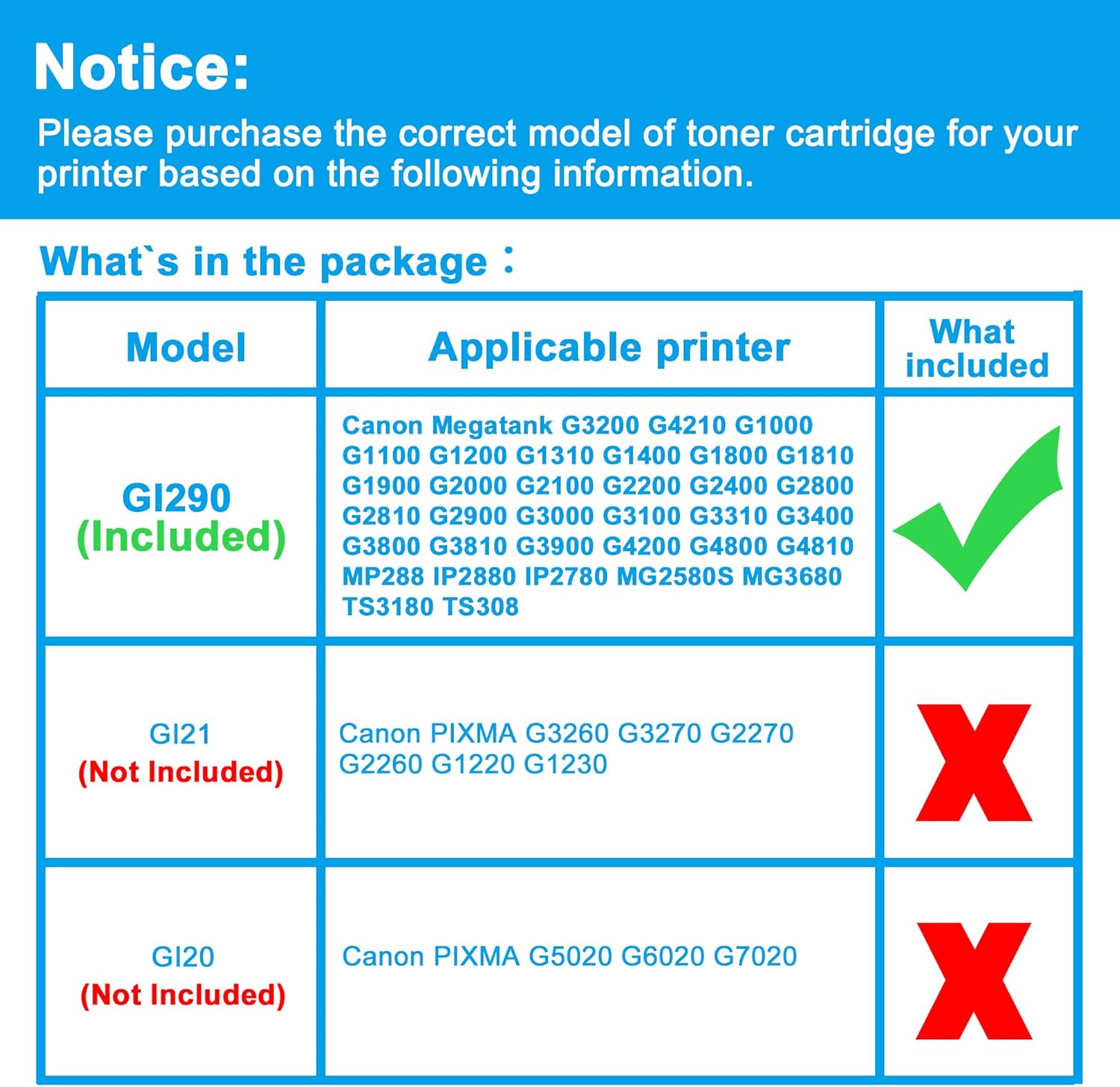- Compatible Printers: Replacement for Canon Megatank G3200 G4210 G1000 G1100 G1200 G1310 G1400 G1800 G1810 G1900 G2000 G2100 G2200 G2400 G2800 G2810 G2900 G3000 G3100 G3310 G3400 G3800 G3810 G3900 G4200 G4800 G4810 MP288 IP2880 IP2780 MG2580S MG3680 TS3180 TS308