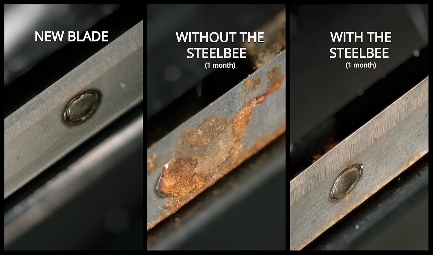 - PREVENTS CORROSION TO EXTEND BLADE LIFE UP TO 3X Releasing patented Zerust Vapor to inhibit rust and degradation the SteelBee is more than just a razor cover it protects the blades and prevents the oxidation of steel to keep your razor edges sharp leading to more shaves from a single cartridge. Zerust vapor tubes continue to emit corrosion inhibitors helping you to enjoy a cleaner smoother shaves for up to two years.
