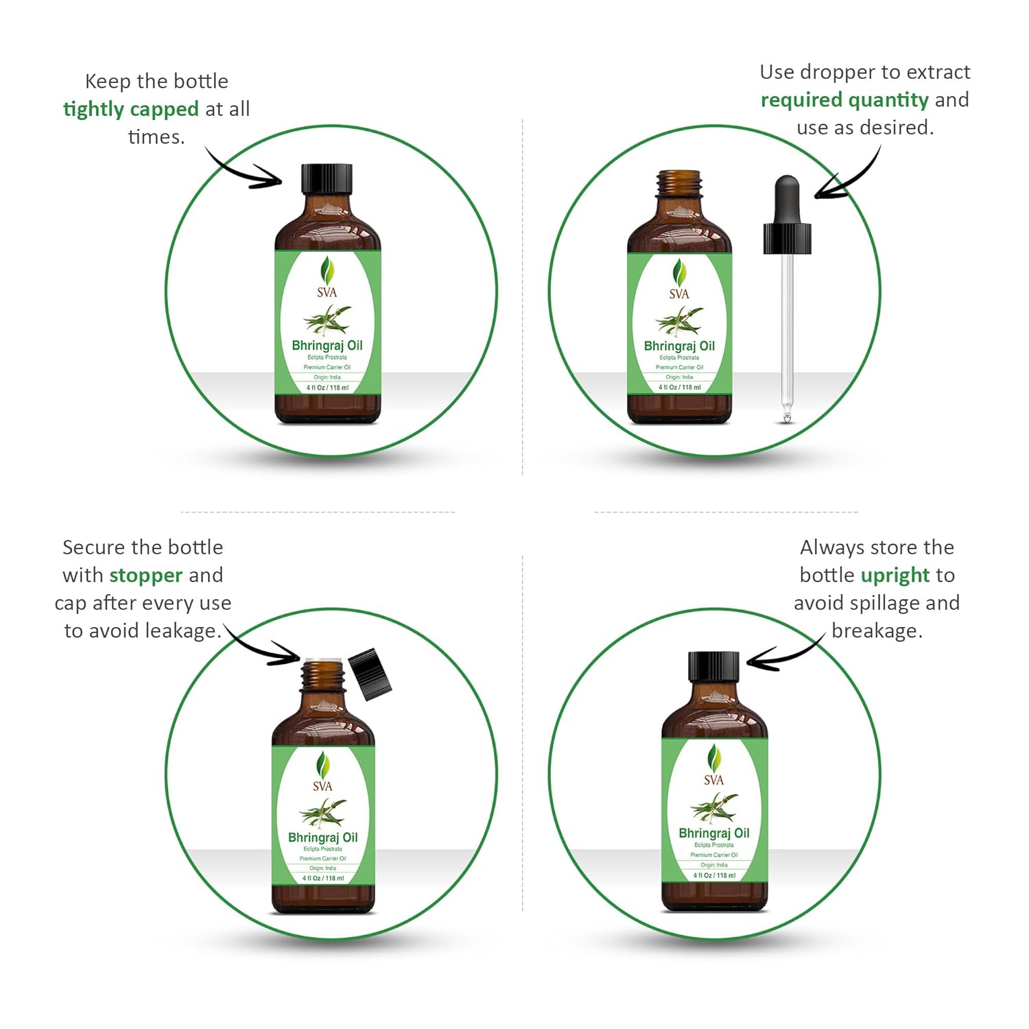 - How To Use: SVA Bhringraj Oil is easy to use. Put a few drops on your palm and gently massage on your scalp for a few minutes. Leave it for 30 minutes and wash your hair with a mild Shampoo. You may leave the oil in your hair overnight for better results.