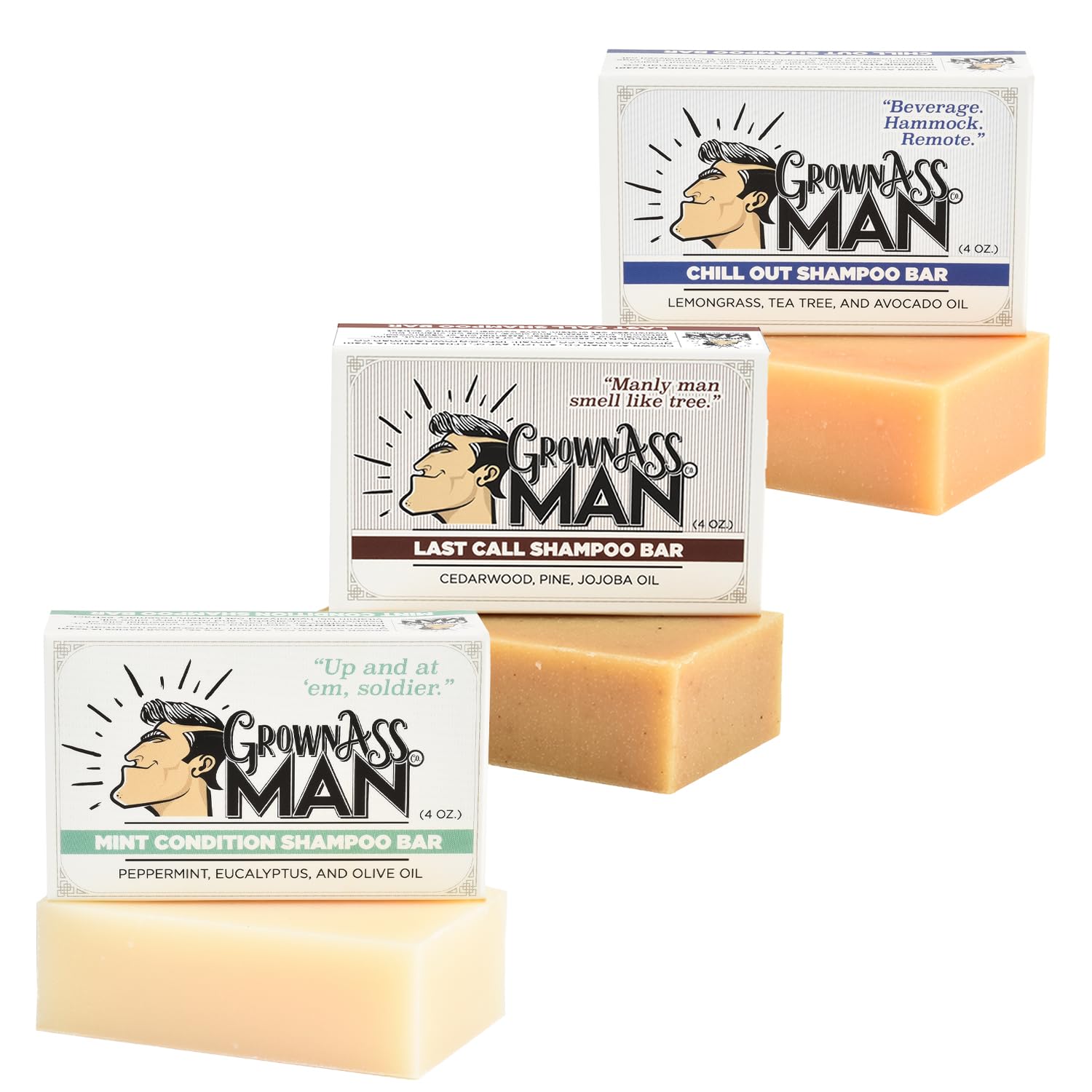 Grown Ass Man Co. - Solid Shampoo Bar Rich Lather 3 in 1: Hair, Beard & Body Wash - Plastic Free & Eco-Friendly, Natural & Organic Clean for All Hair Types, 4oz Bar (Variety, 3-Pack)