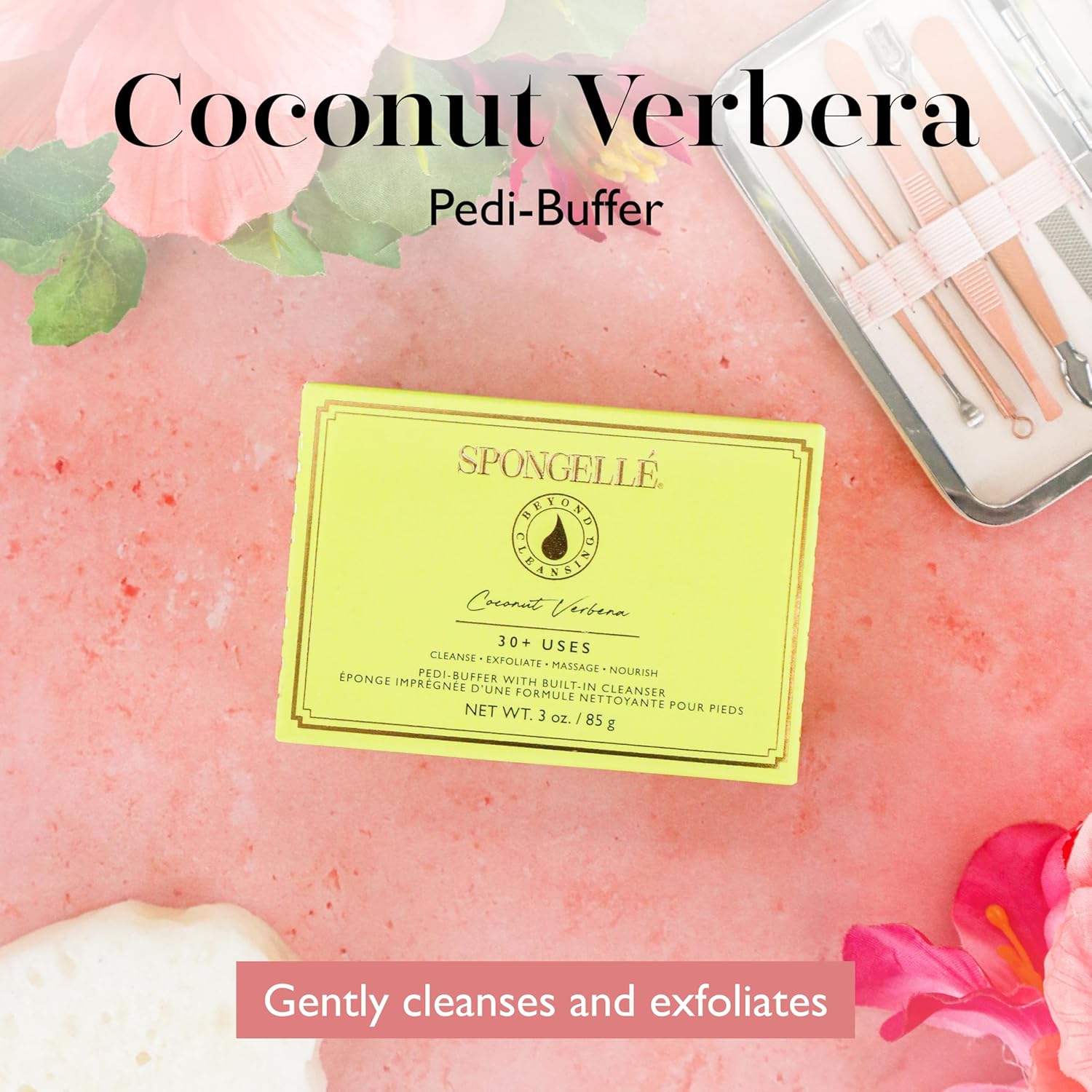 SPONGELLÉ Coconut Verbena Pedi-Buffer with Built-in Cleanser - Exfoliates, Softens & Smooths Feet for a Spa-Like Pedicure Experience, 30+ Uses