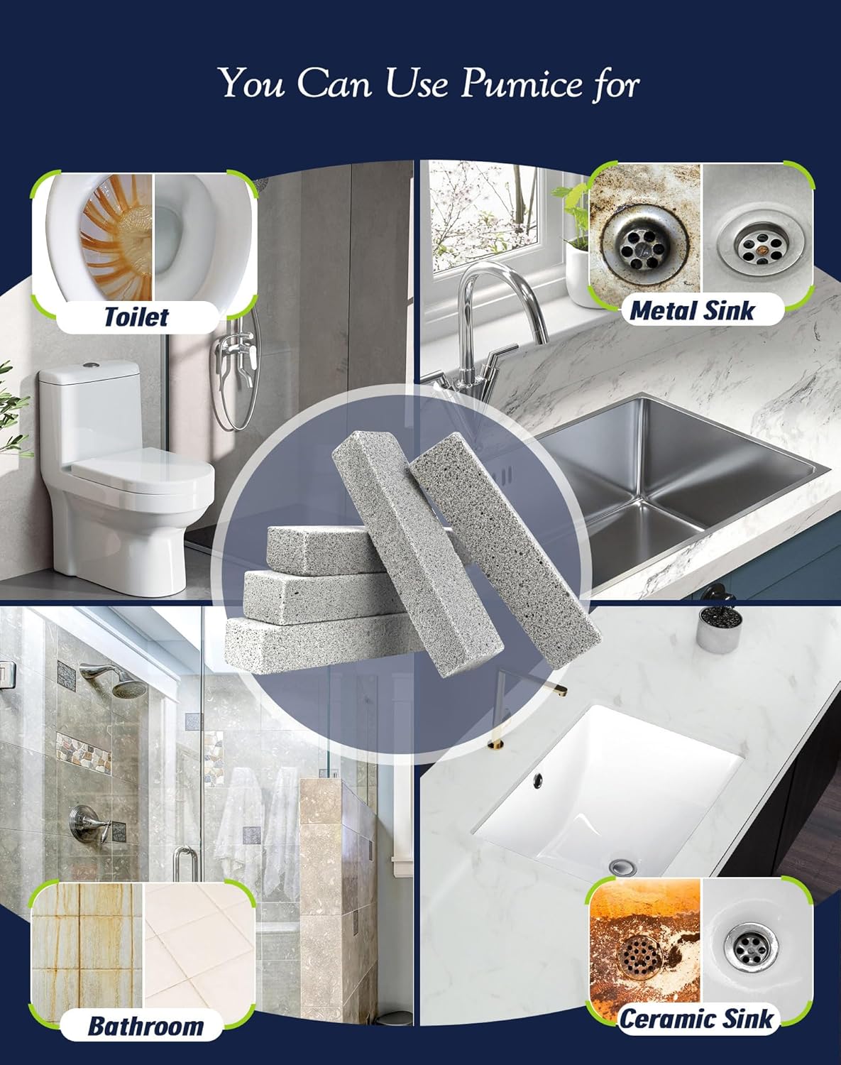 - All-purpose Cleaning Tools - Pumice sticks can be applied to clean tile, bathroom and kitchen, clear away hard water rings, clean rust from grills. Besides, use them to clean and scour away lime, calcium and rust build up from the Tile, Shower stalls, Bath tubs, Sinks, Metals, Porcelain, Stainless Steel, etc