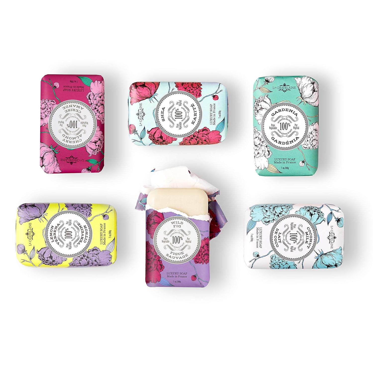 La Chatelaine Luxury Soap Collection | Oprahs Favorite Things | Shea Butter Bar Soaps, Made in France | Natural | Set of 6, 7 oz (Gardenia, Coconut Milk, Lemon Verbena, Cherry Almond, Shea, Wild Fig)