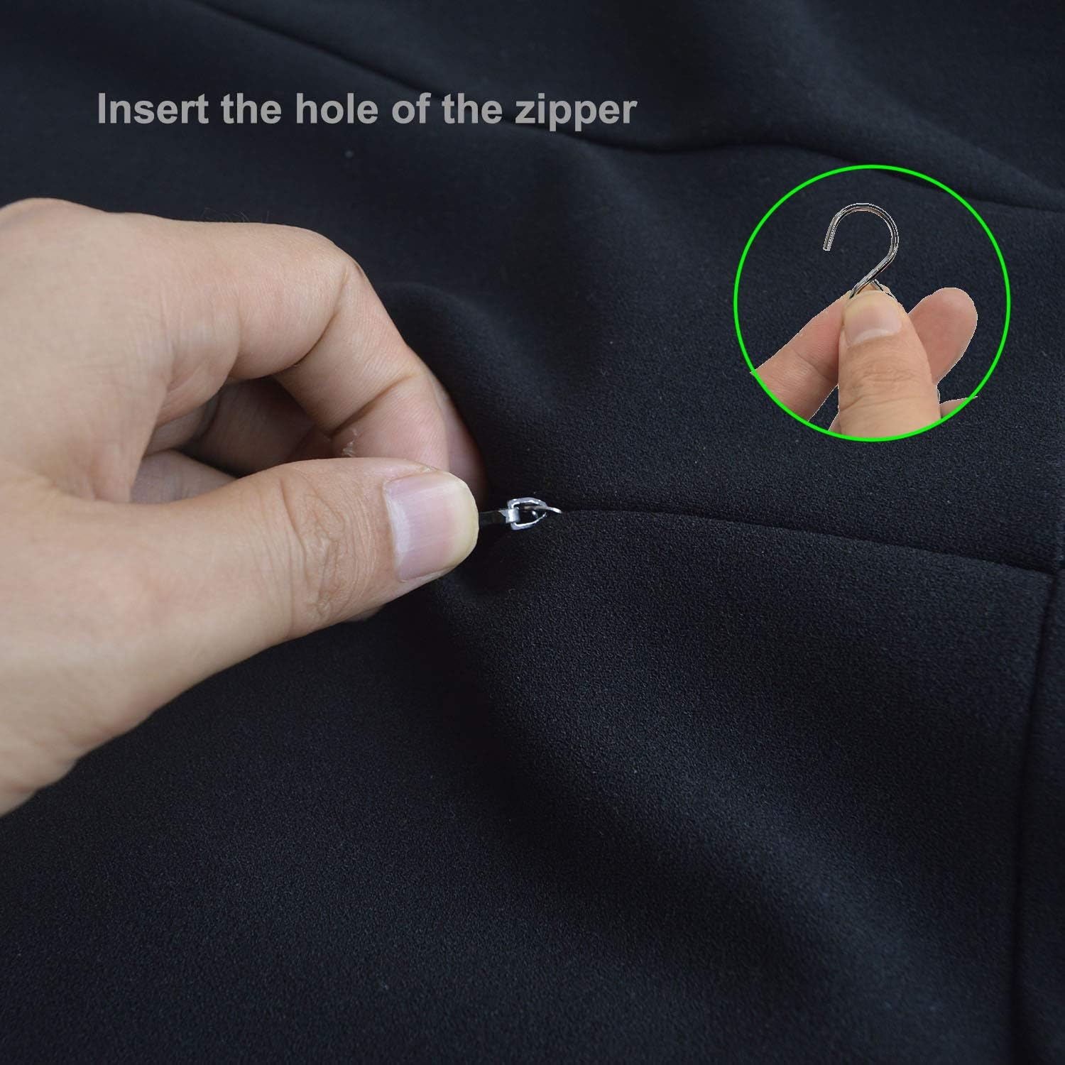 - Safety hook securely attaches to regular and invisible zippers allowing it to remain attached when zipping and unzipping