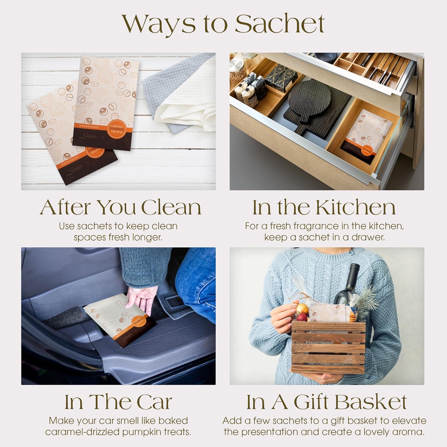- VERSATILE USAGE OPTIONS : These aromatic sachets are ideal for refreshing spaces such as cars, gym bags, trash cans, under beds, or small rooms where candles canât be used. Place them in drawers, closets, or suitcases to maintain a fresh scent while doubling as a subtle, decorative touch.