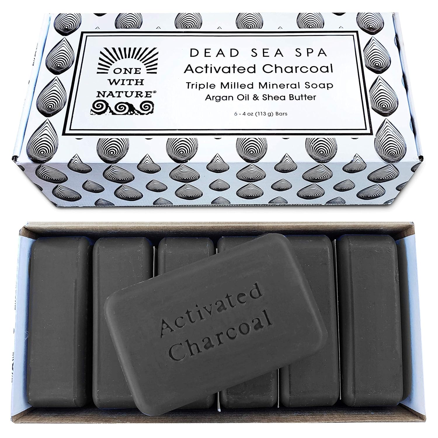 One With Nature Activated Charcoal Soap 4oz 6-Pack Gift Box – Detoxifying and Exfoliating Charcoal Soap Bar with Dead Sea Salt for Face & Body, for Men & Women