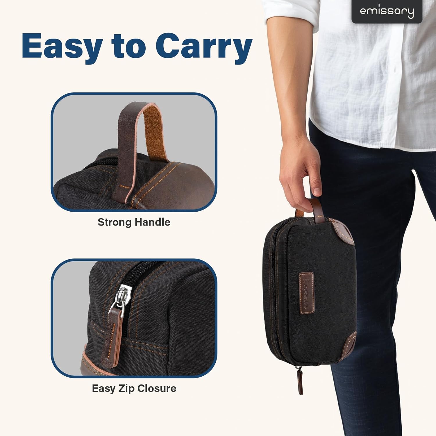 - HIGH-QUALITY DURABLE MATERIAL: This exceptional toiletry travel bag by emissary is made of canvas and PU leather, which is known for its lightweight yet durable qualities, the perfect combination for traveling; This specific material is water resistant, making it safe for use in environments where it may become wet; Making this the perfect bathroom bag, shaving bag, and travel dopp kit