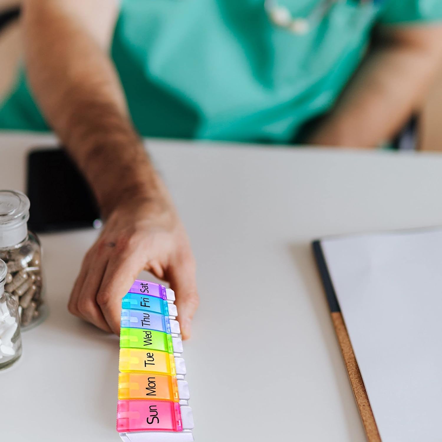 - COLORFUL COMPARTMENTS: 7 individual compartments each with a unique transparent colored lid for easy viewing. You can see your pills and tablets easily in this rainbow-colored pillbox.