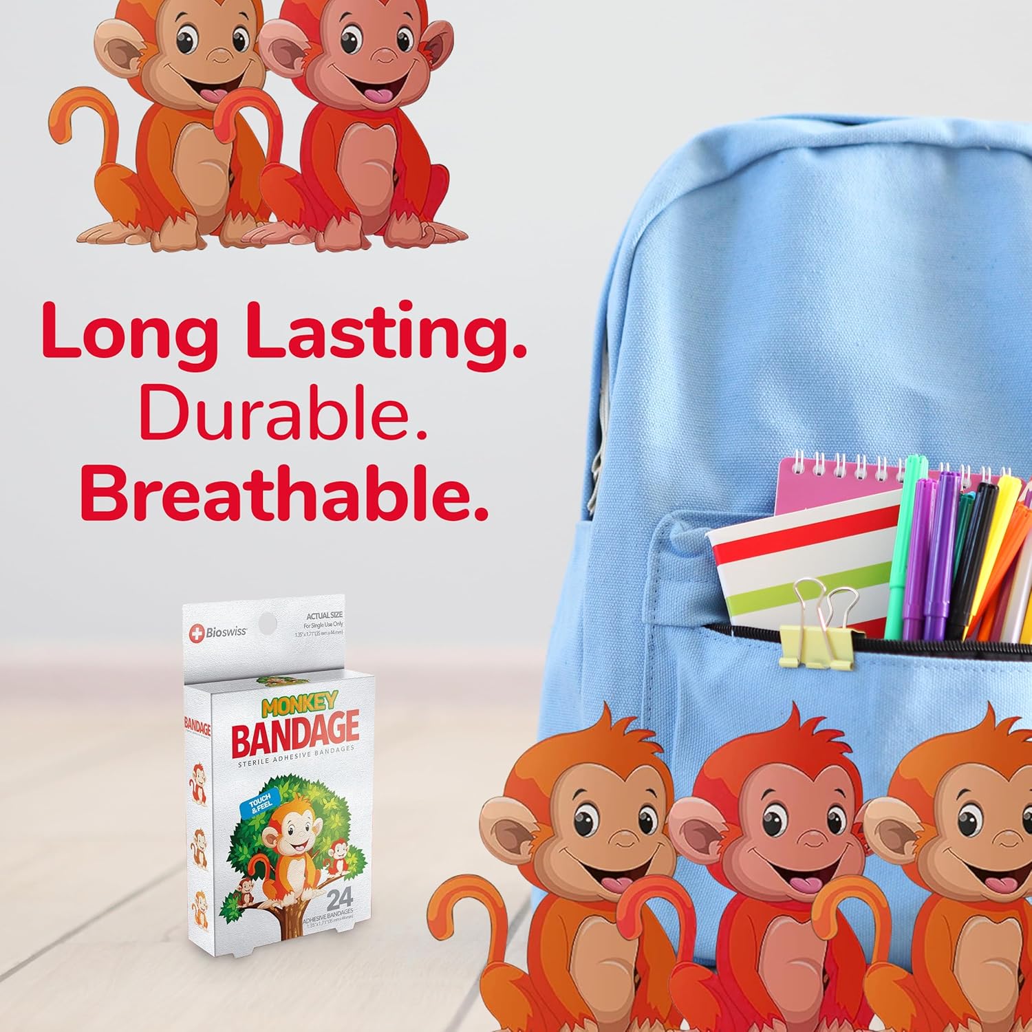 BioSwiss Kids Bandages, Monkey Shaped Self Adhesive Bandage Set, Latex Free, Sterile Wound Care, 24 Count